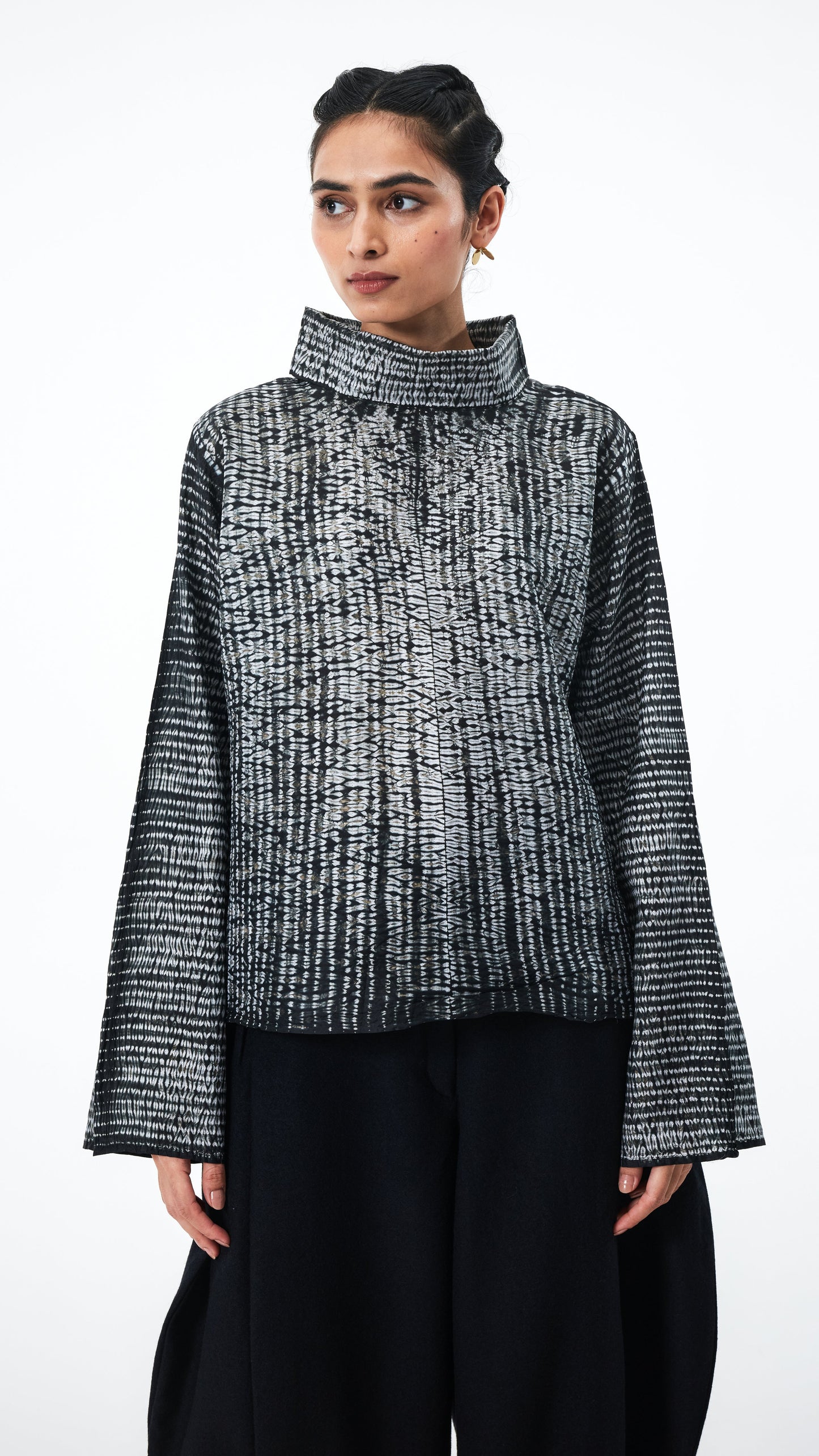 A relaxed fit, high neck top featuring all over shibori in shades of black and white. This versatile silhouette features a soft roll neck, full sleeves and a fit that drapes comfortably on the body. Made in Silk.