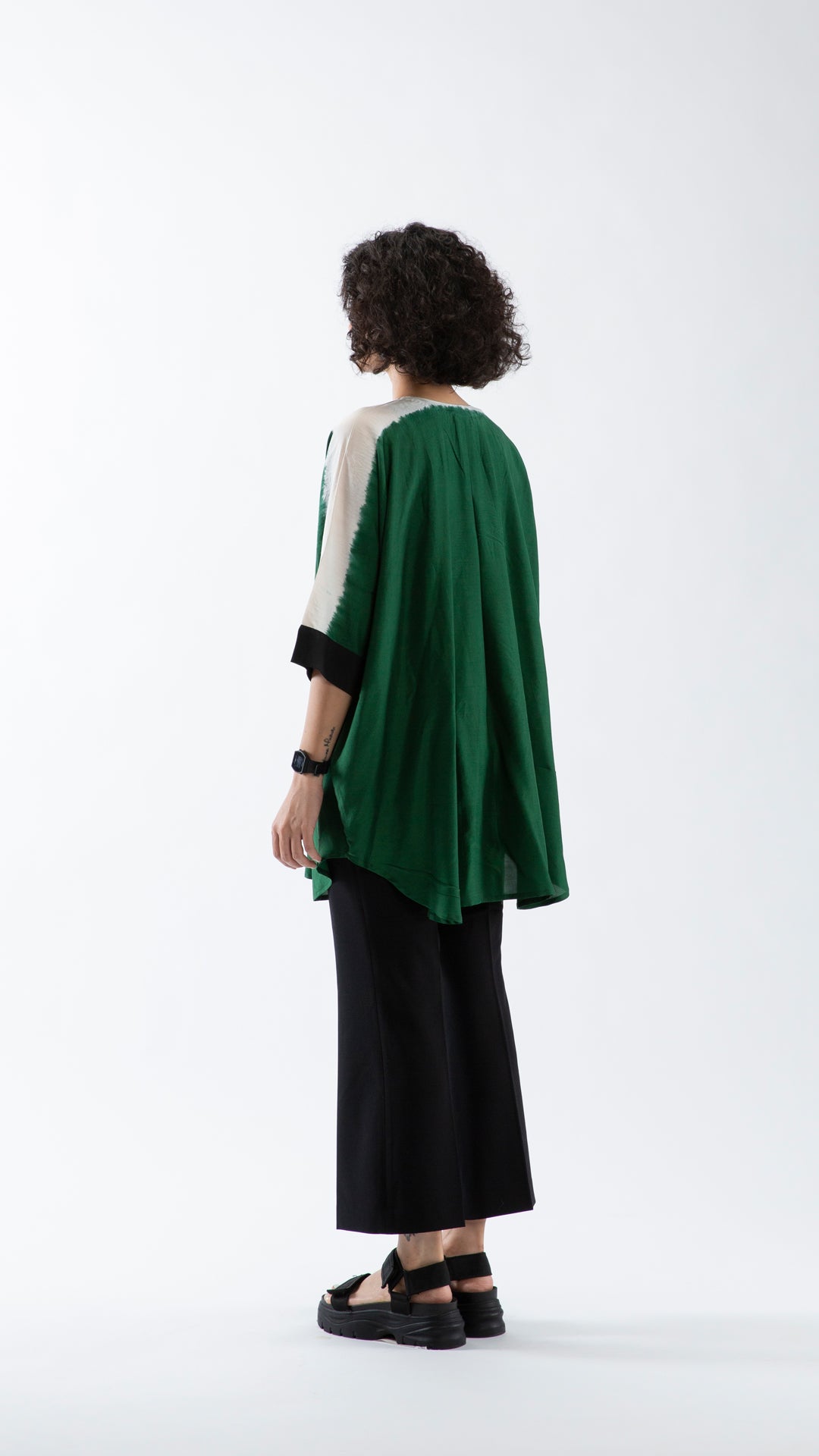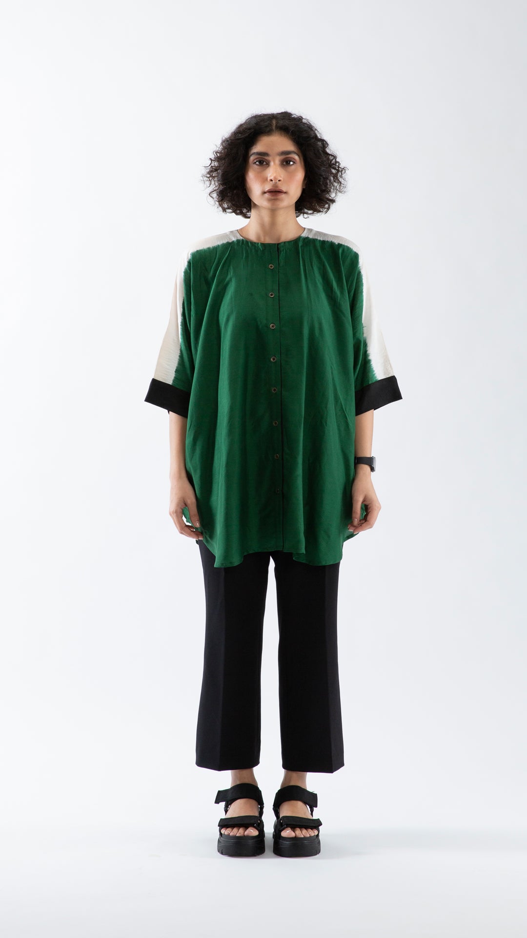 Freesize vegan silk shirt dyed in Bottle-green, with a colour-blocked detail on the sleeves and metal buttons for closure.