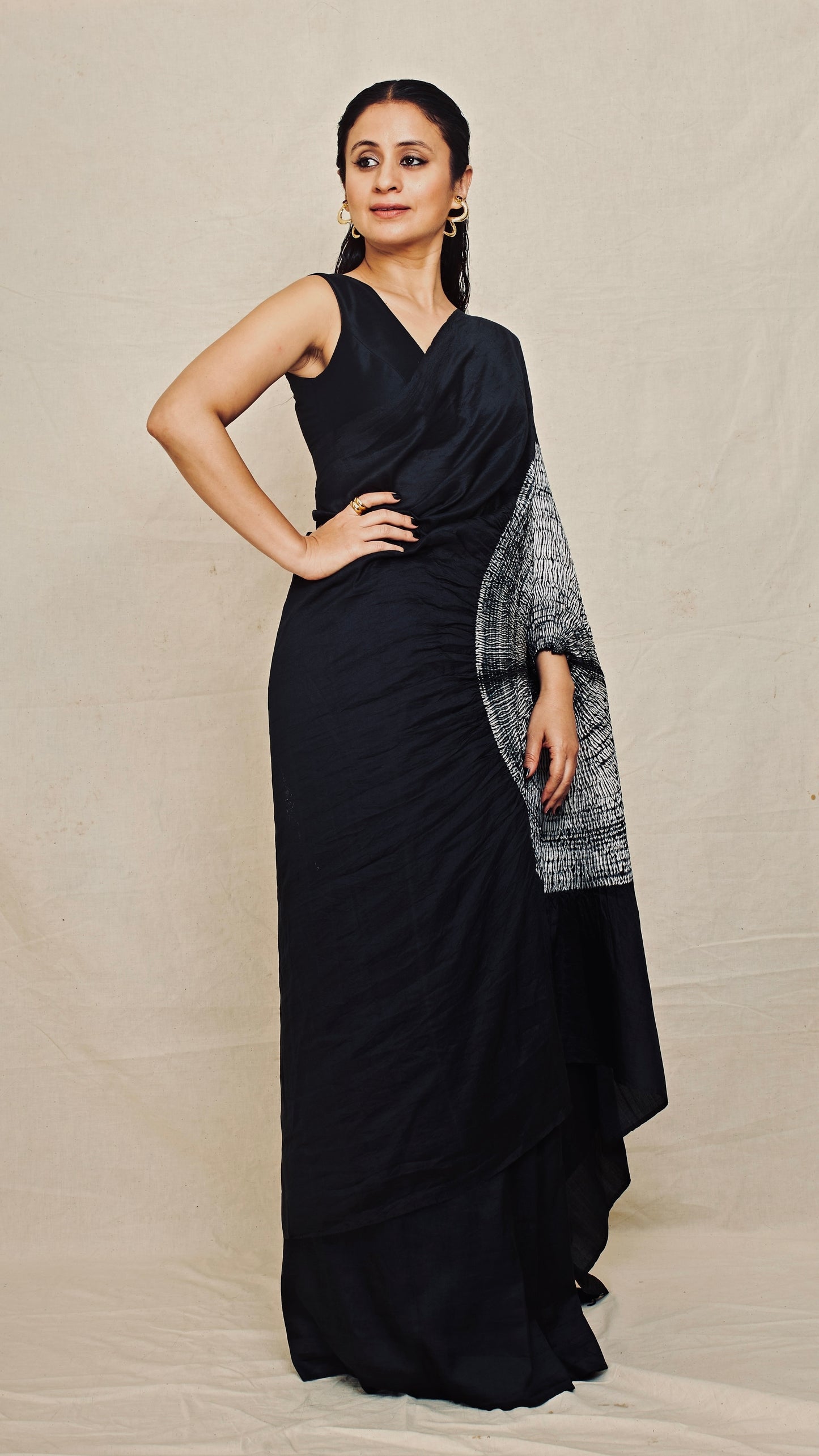 Handwoven hands-free silk saree with an elaborate shibori detail on the pallav. It comes with a black silk blouse piece.