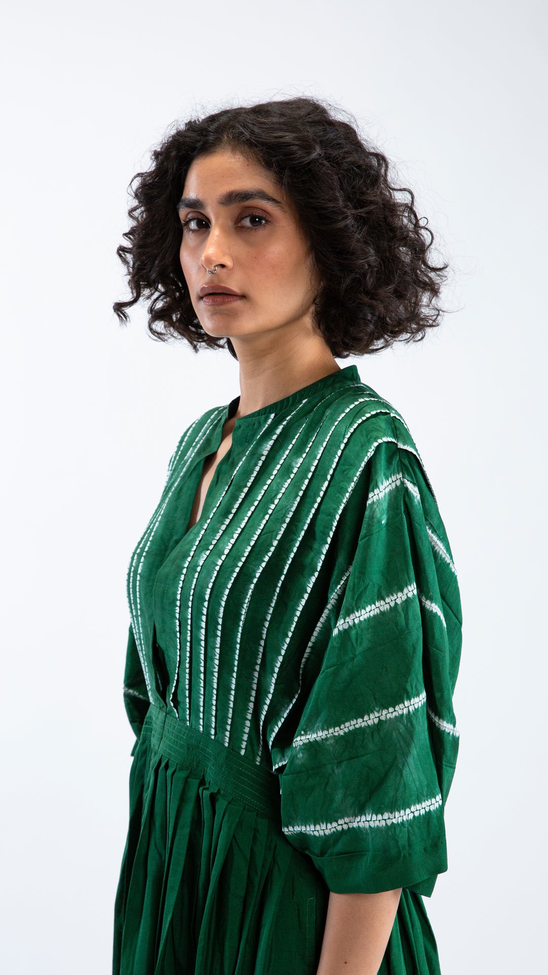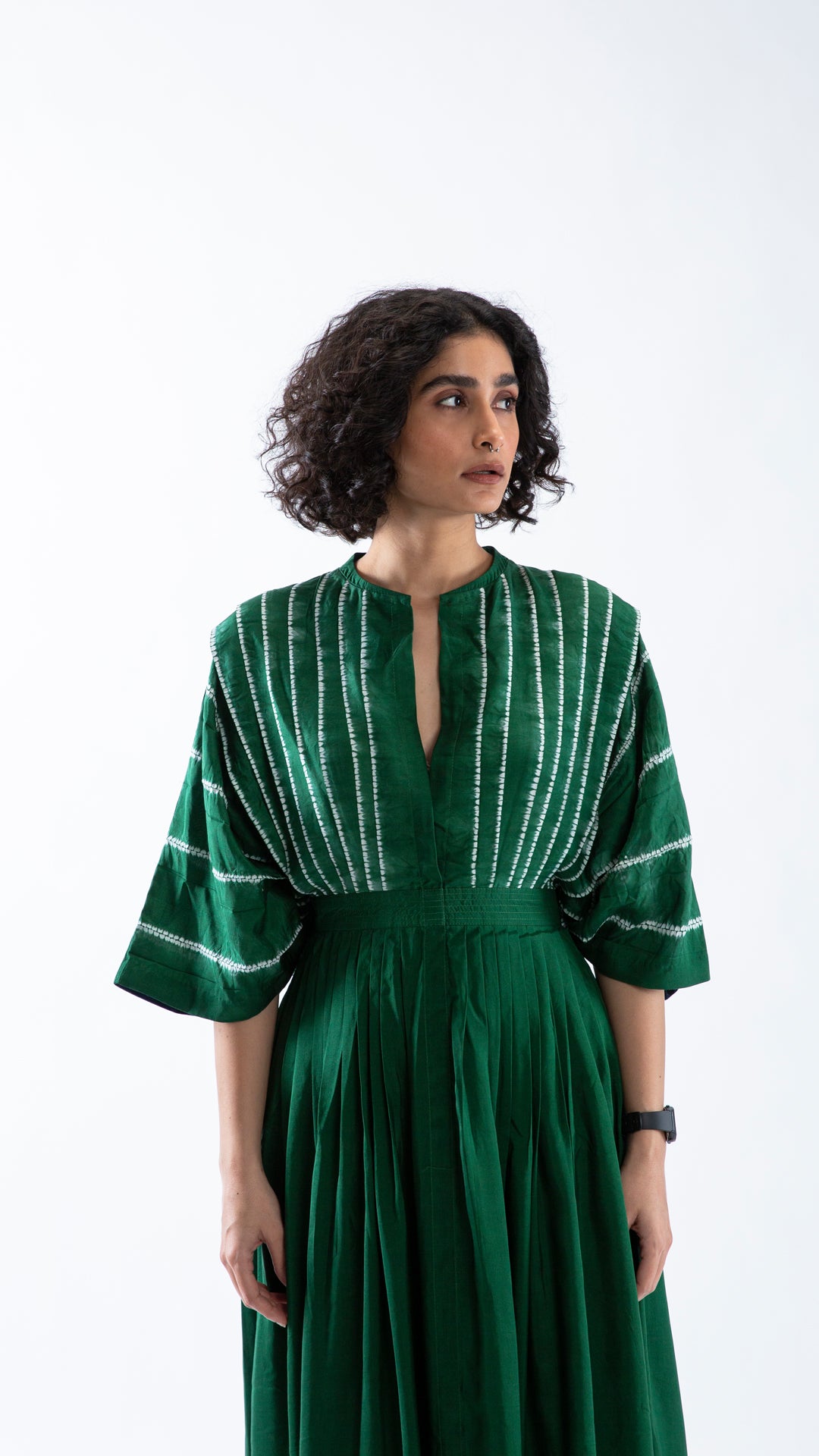 Vegan Silk pleated dress hand-dyed in bottle-green, with an engineered Ori Nui Shibori pattern in the yoke.