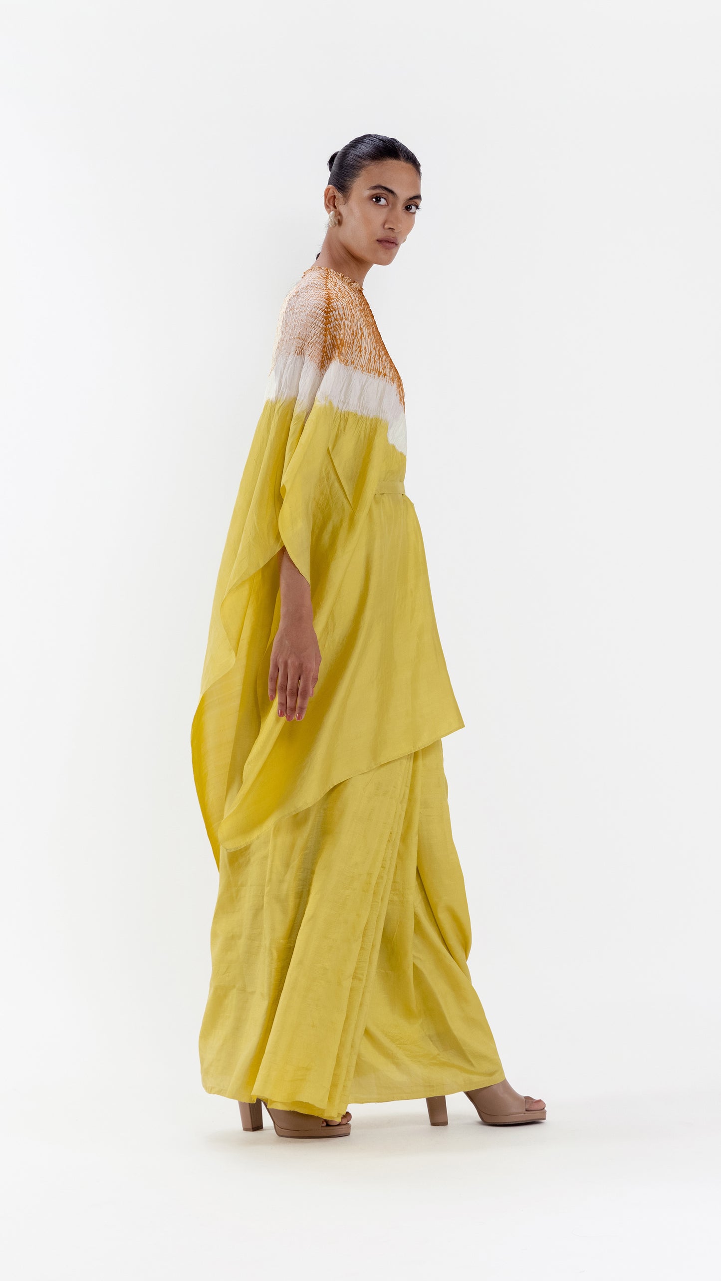 Handwoven saree dyed in lime with our signature shibori detail on the neckline. It comes with an unstitched silk blouse piece and a textile belt for the waist.