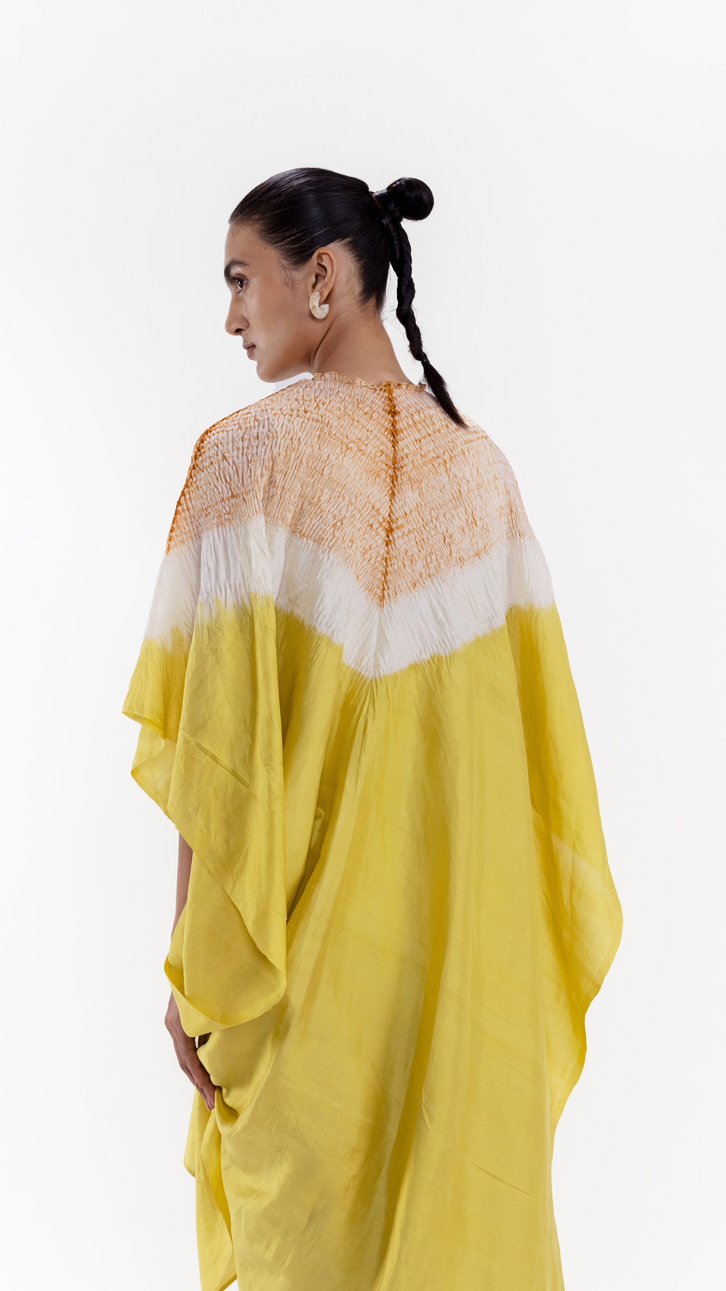 The colours you see on screen may appear substantially different from the actual colours of the product. This is due to the variation in colour reproduction in camera and screen. Dry clean only, however shibori should be capped to retain the texture.