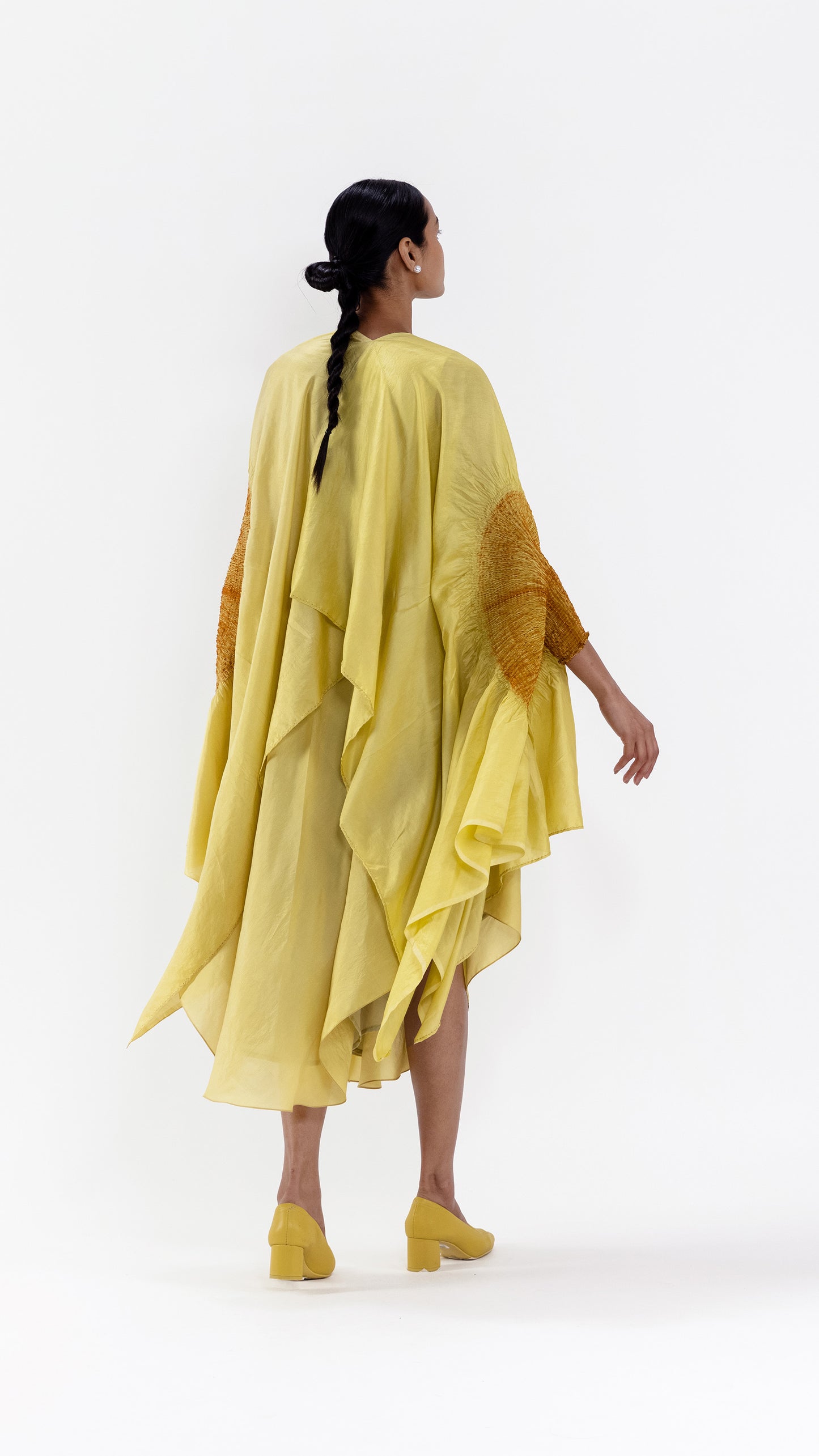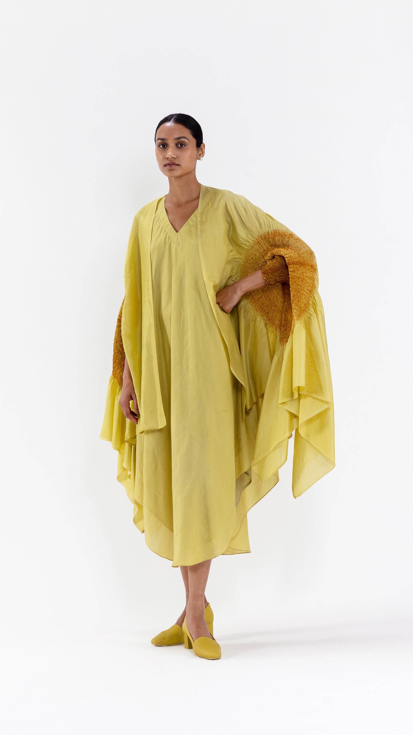 Free-size silk cape with our signature shibori sleeves in shades of lime and brown.