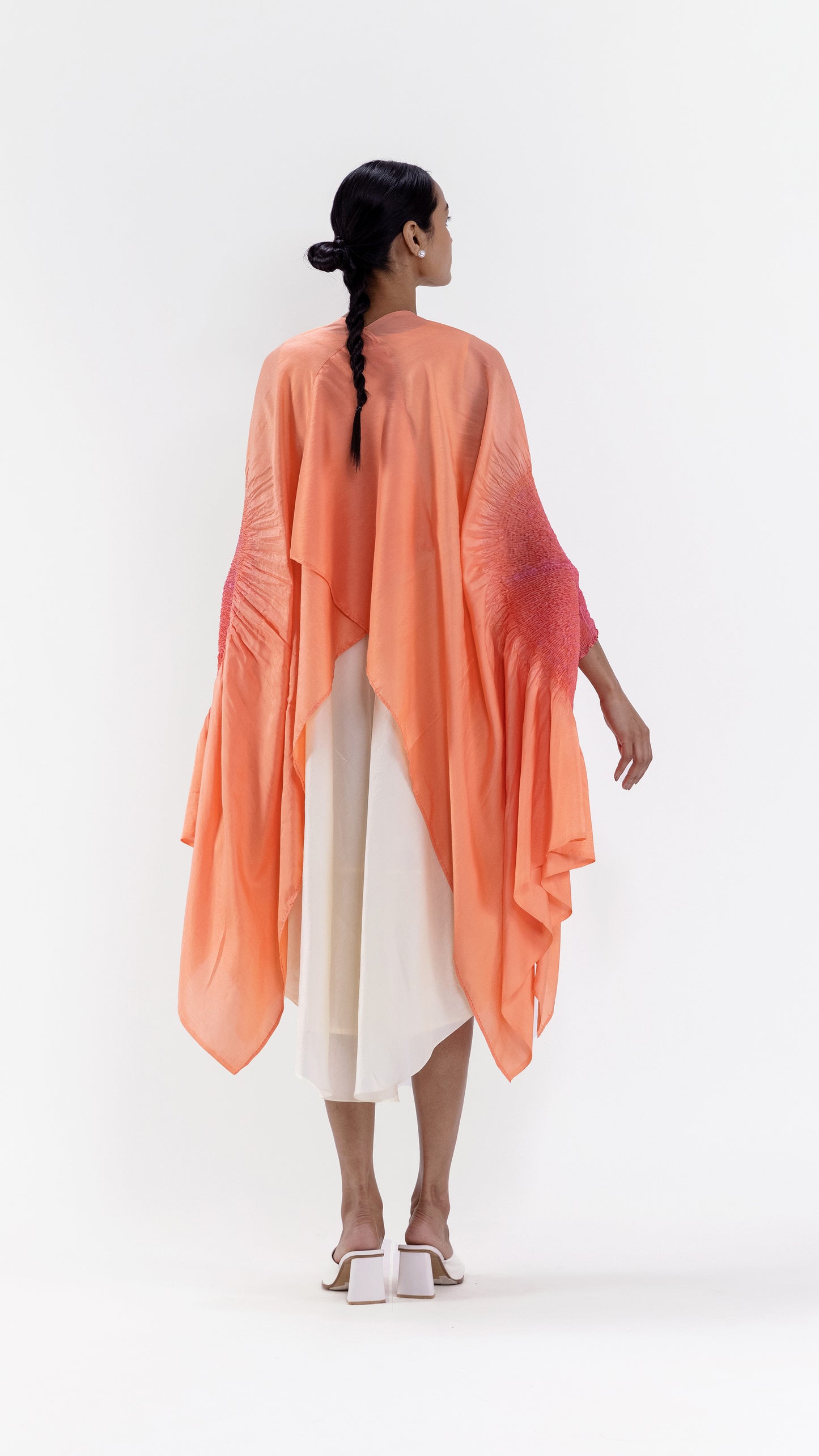 Free-size silk cape with our signature shibori sleeves dyed in shades of pink.