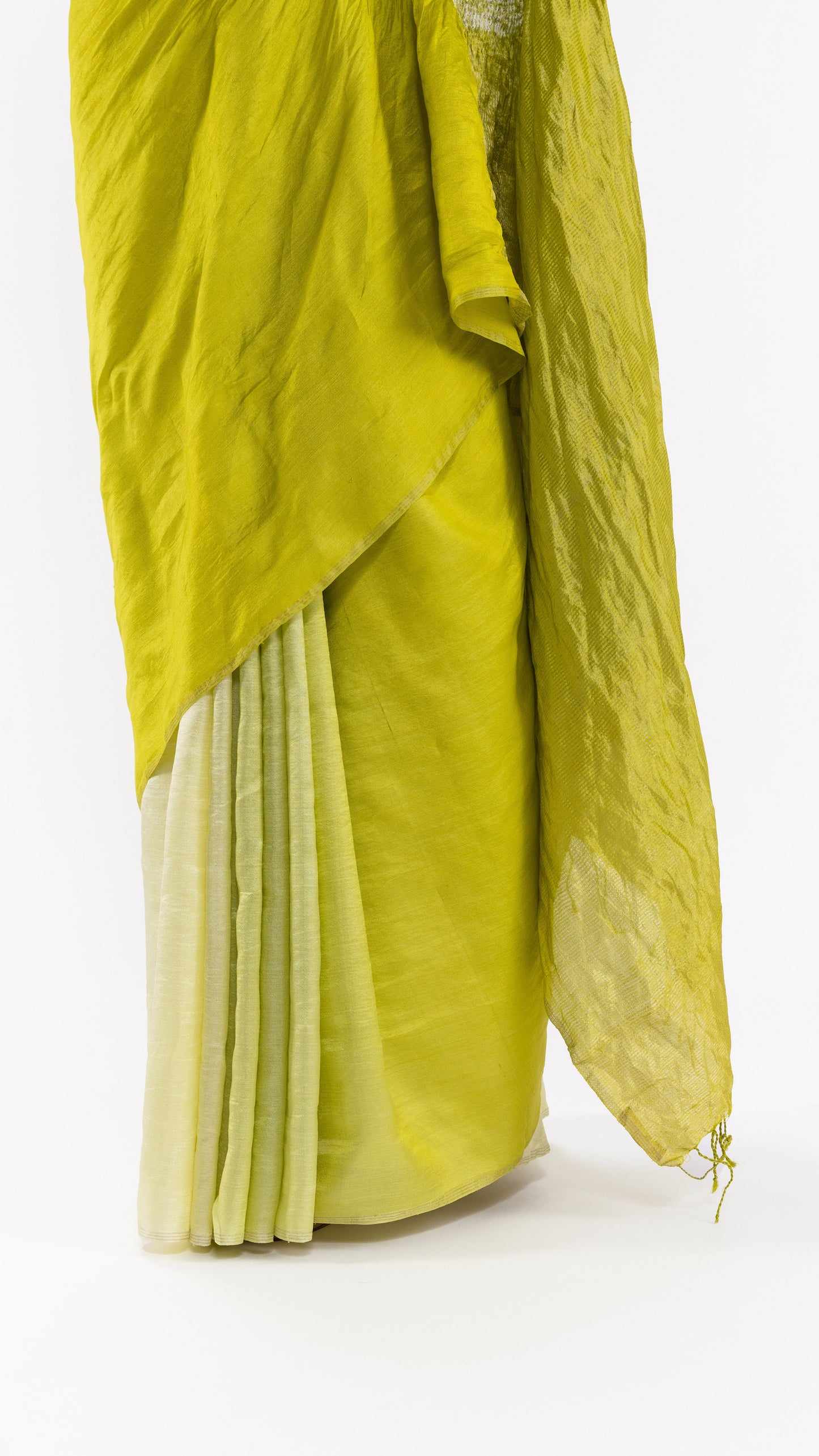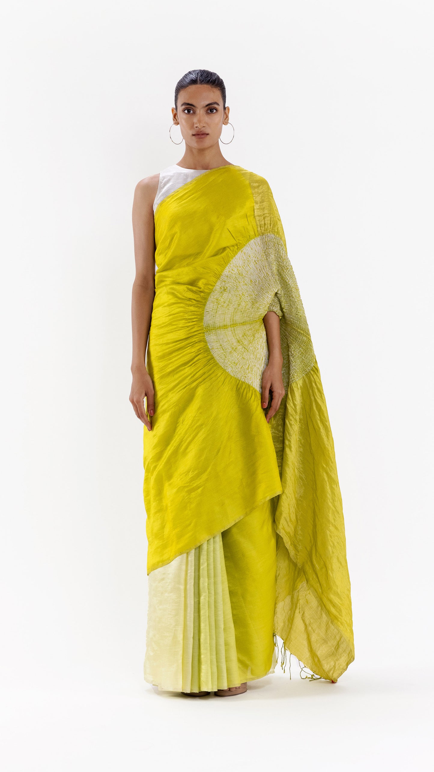 Handwoven silk saree with our signature shibori sleeve detail and a striped metallic pallav, dyed in a lime ombre. It comes with an unstitched lime silk blouse piece.