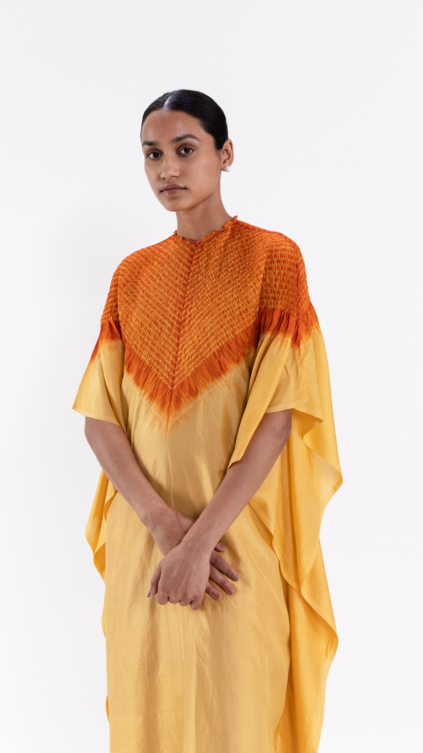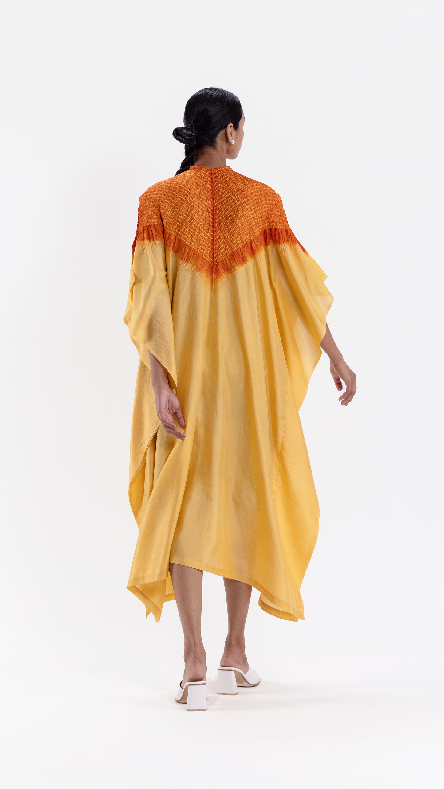 Free-size silk kaftan with our signature shibori neckline, dyed in shades of yellow and rust.