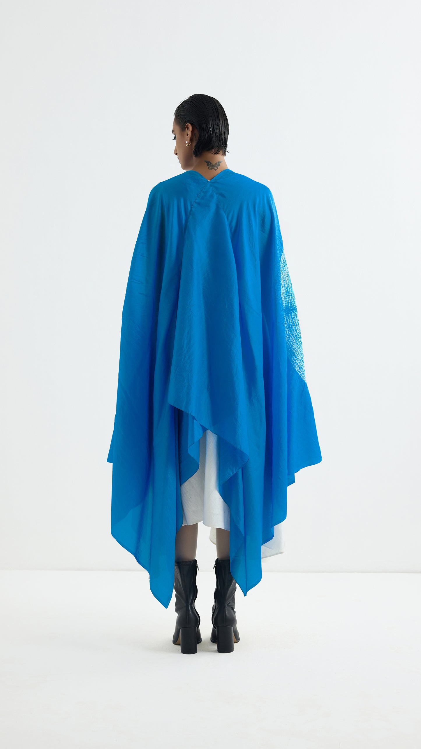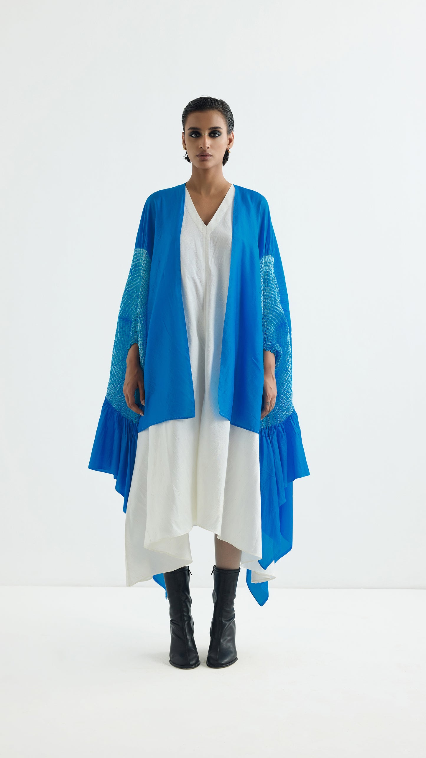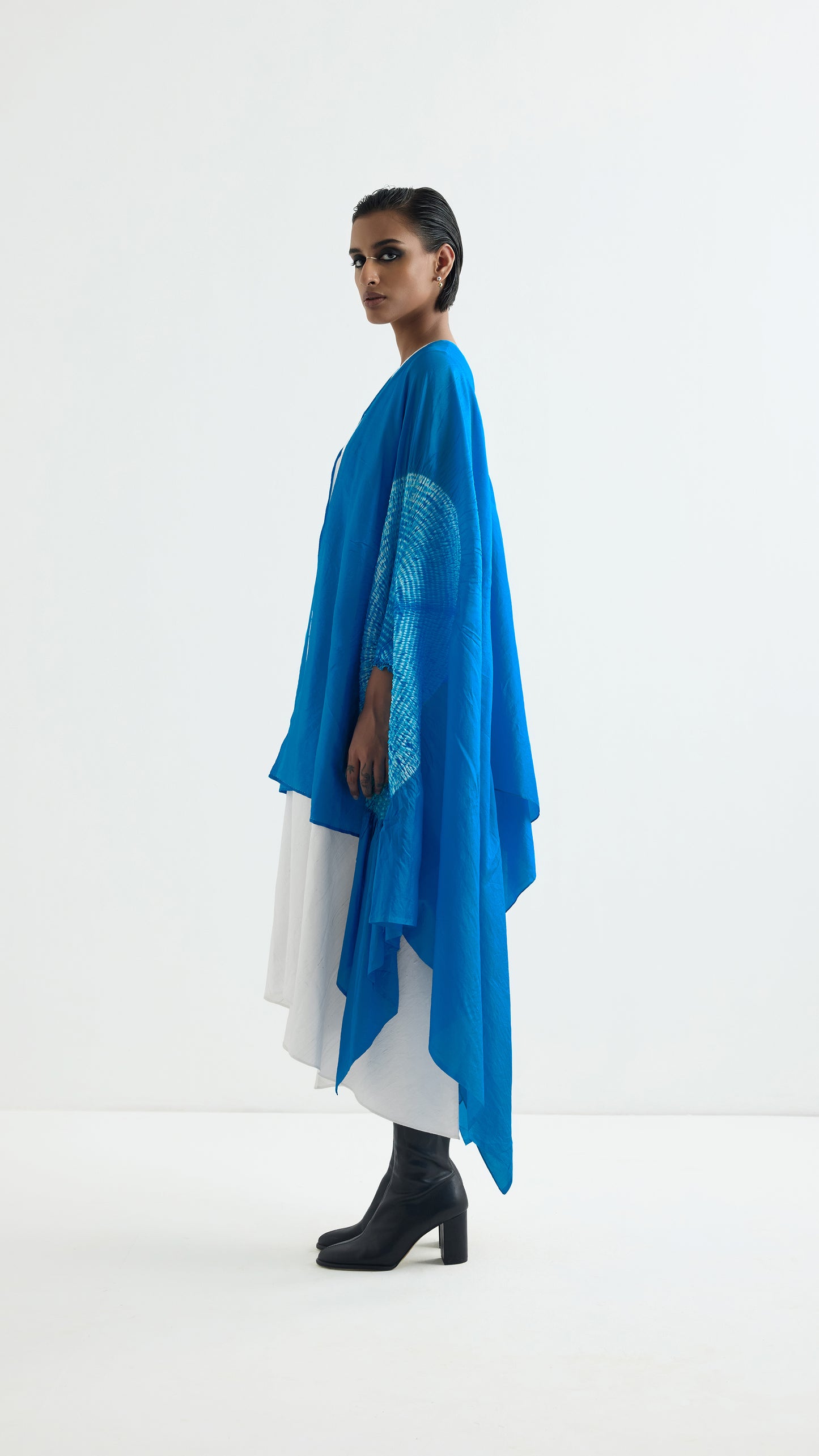 Free size silk cape with our signature shibori sleeve dyed in methyl blue.