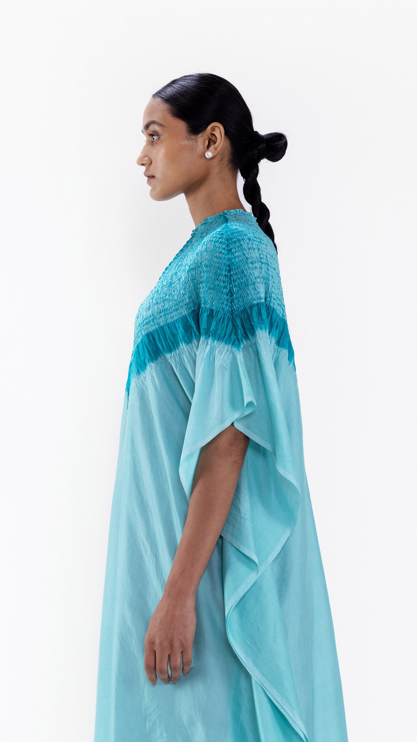 Free-size silk kaftan with our signature shibori neckline, dyed in shades of blue.