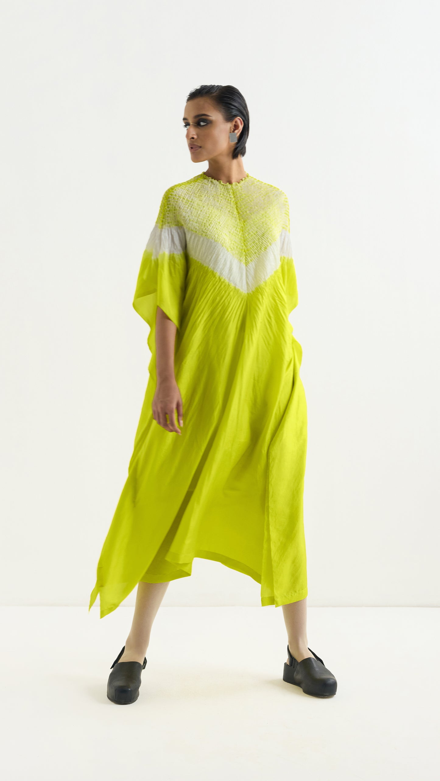 Free size silk kaftan with our signature shibori triangle neckline, dyed in lime