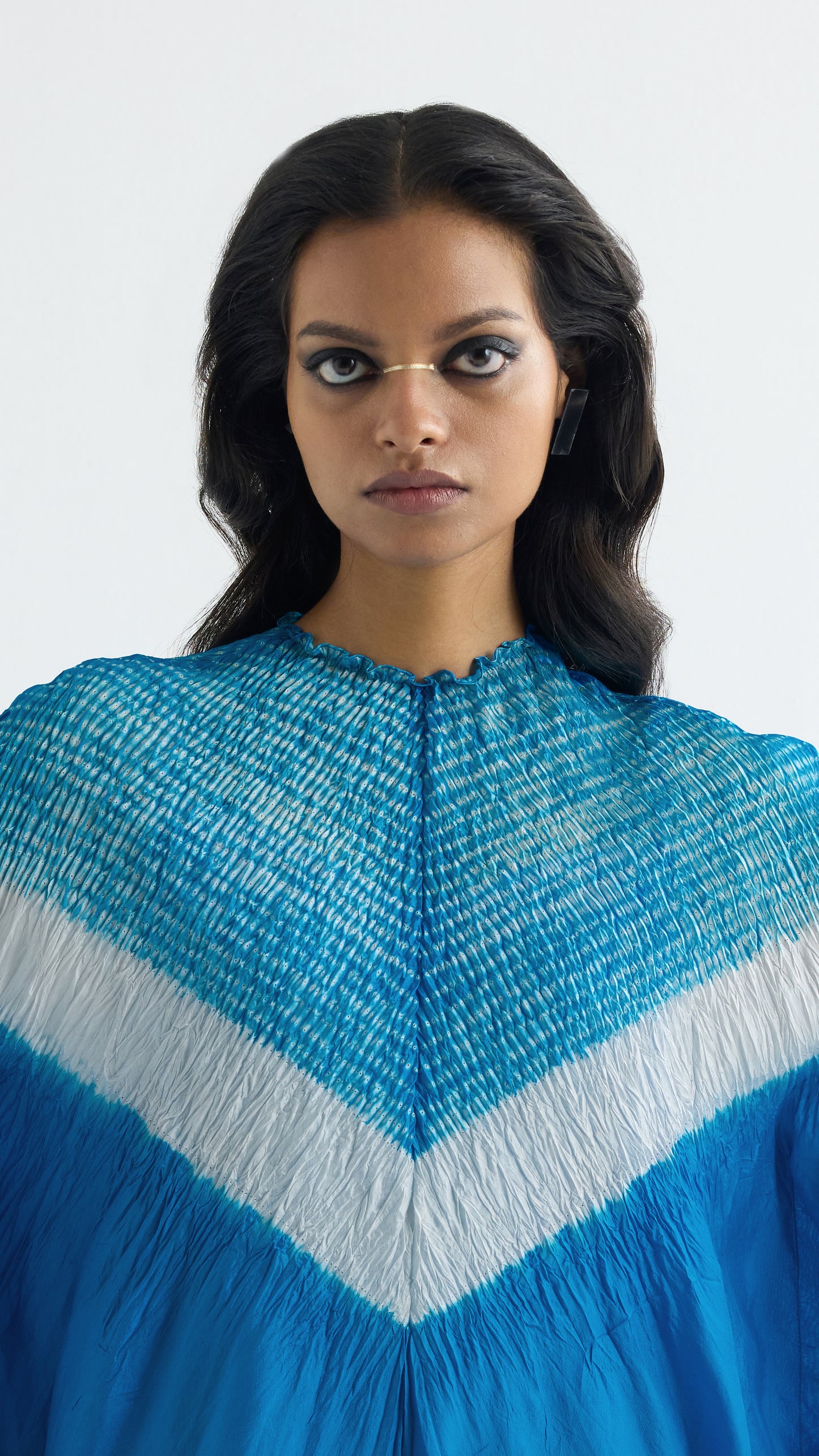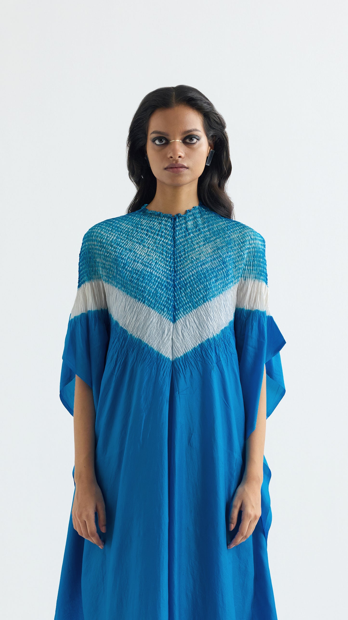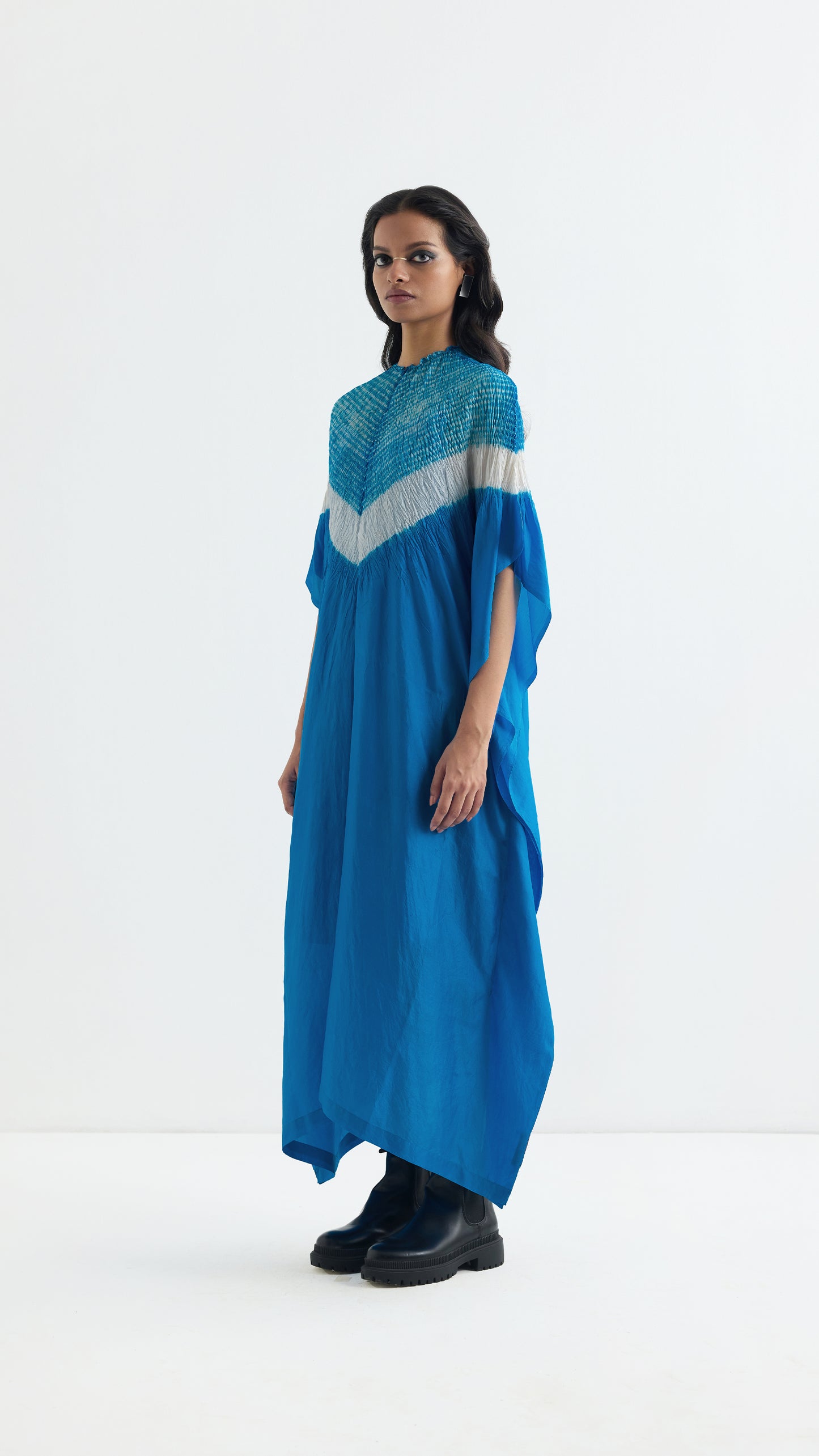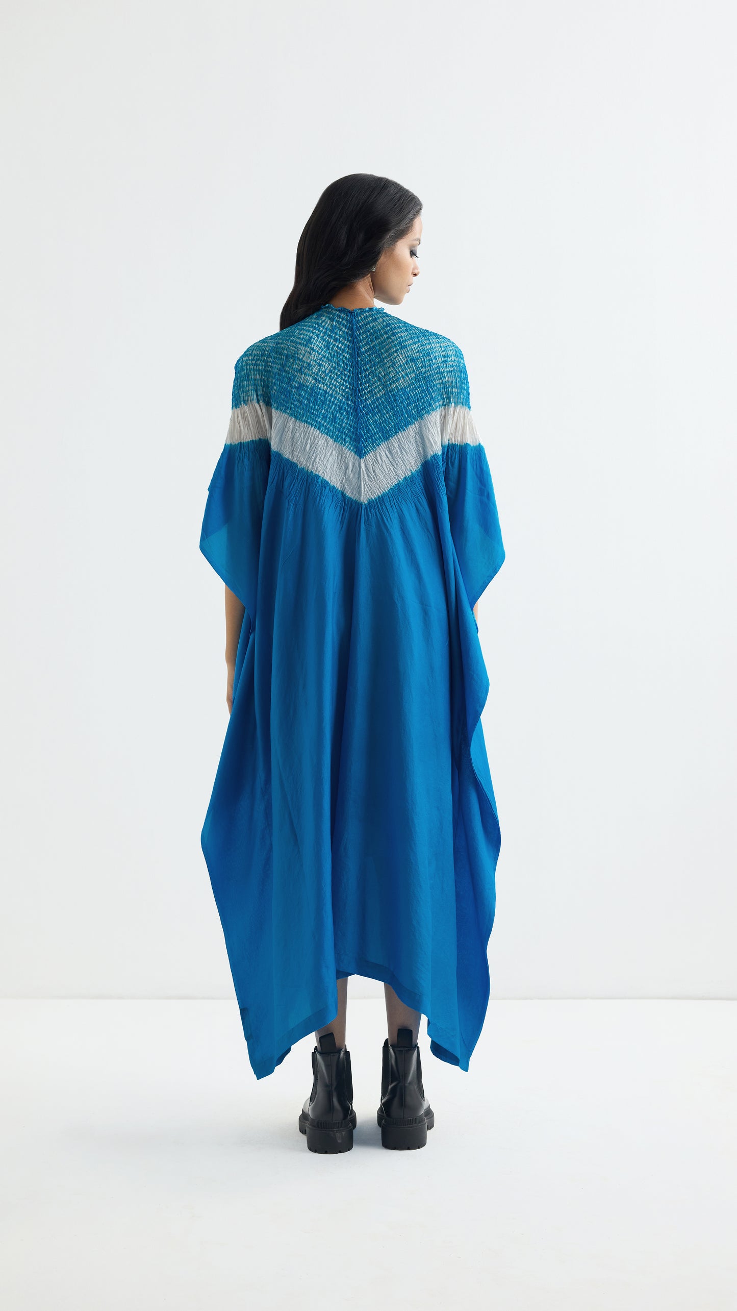 Free size silk kaftan with our signature shibori triangle shaped neckline, dyed in an all new methyl blue.