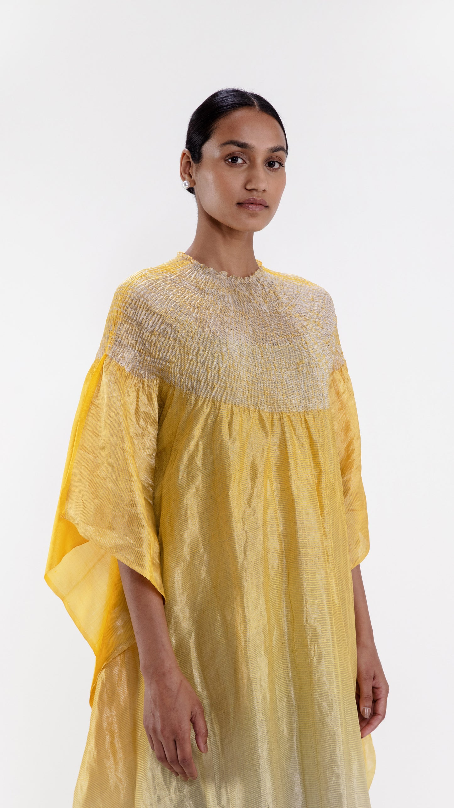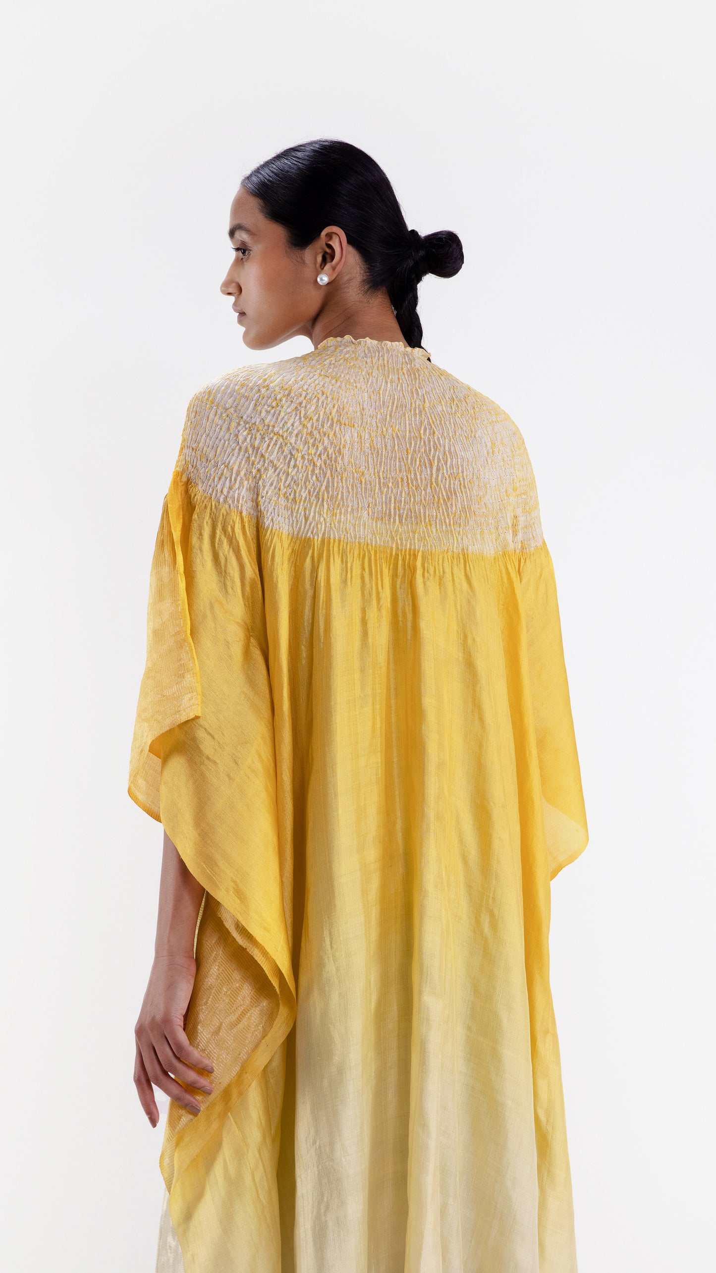 Free-size striped metallic silk kaftan with our signature shibori neckline, dyed in yellow ombre.