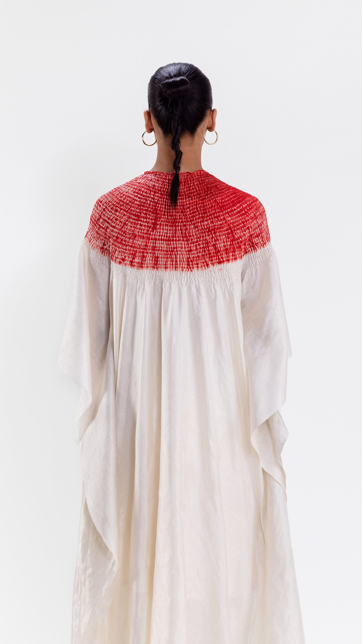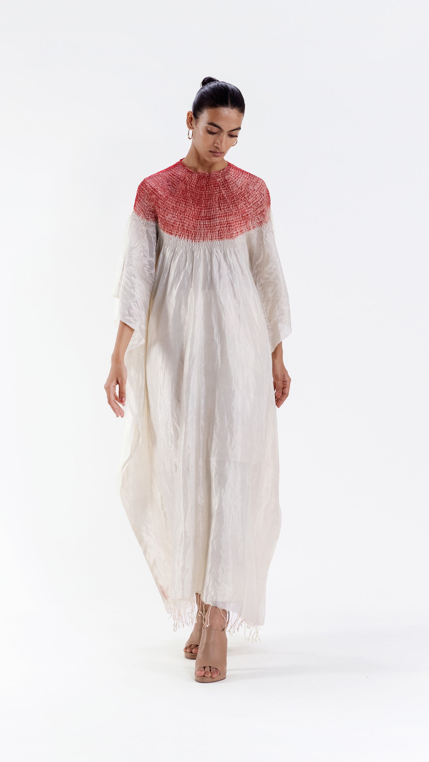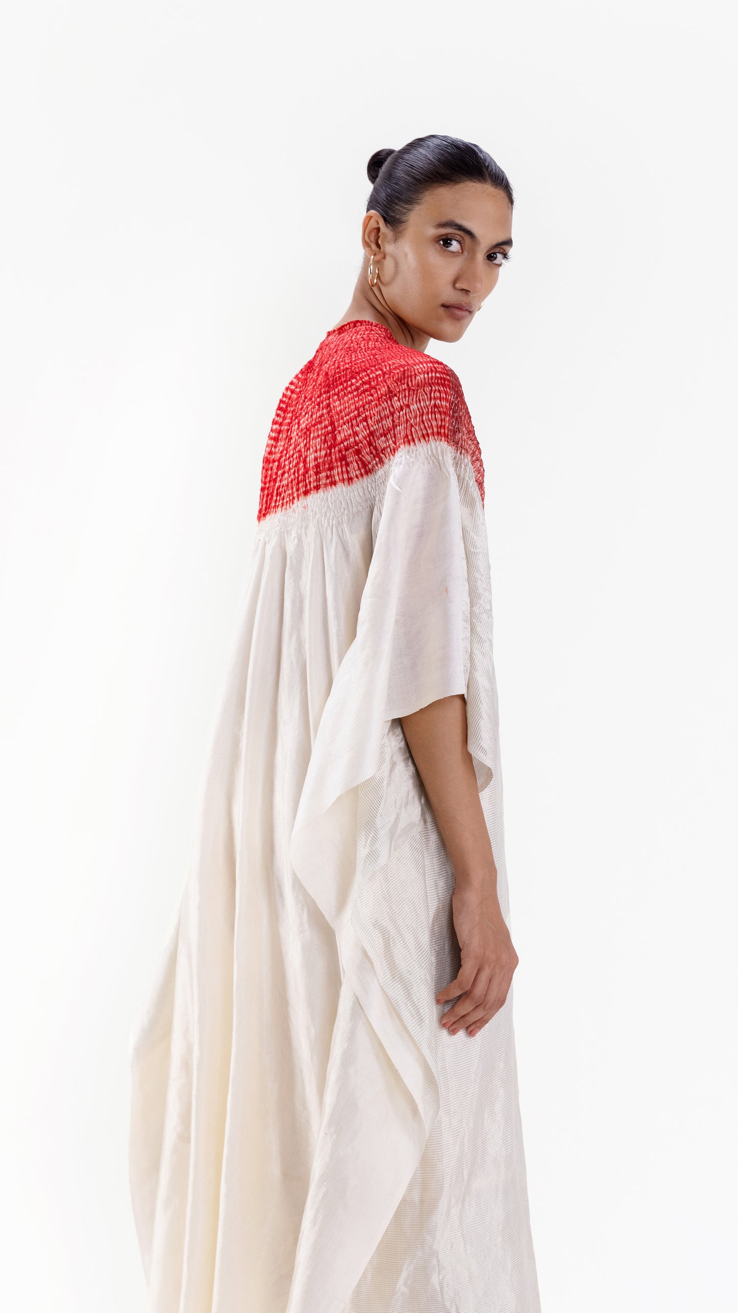 Free-size striped metallic silk kaftan in ivory with our signature shibori neckline, dyed in red.