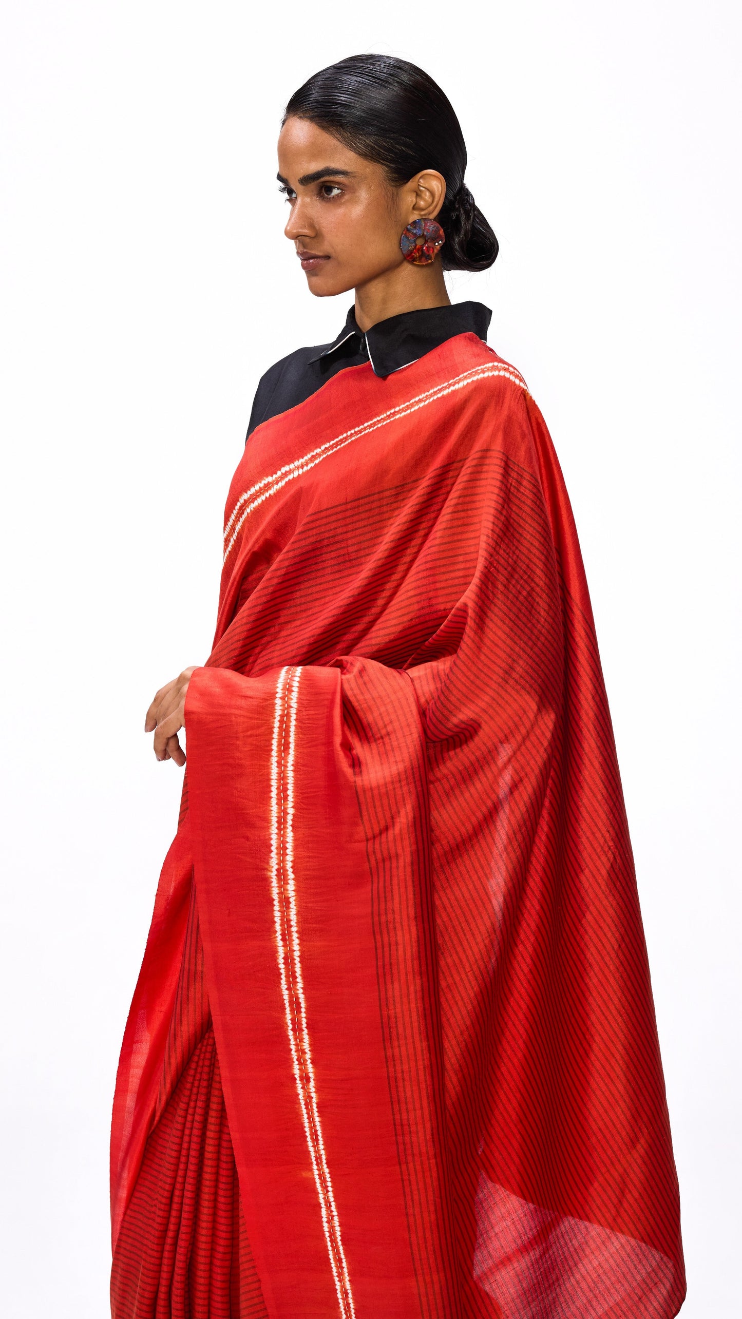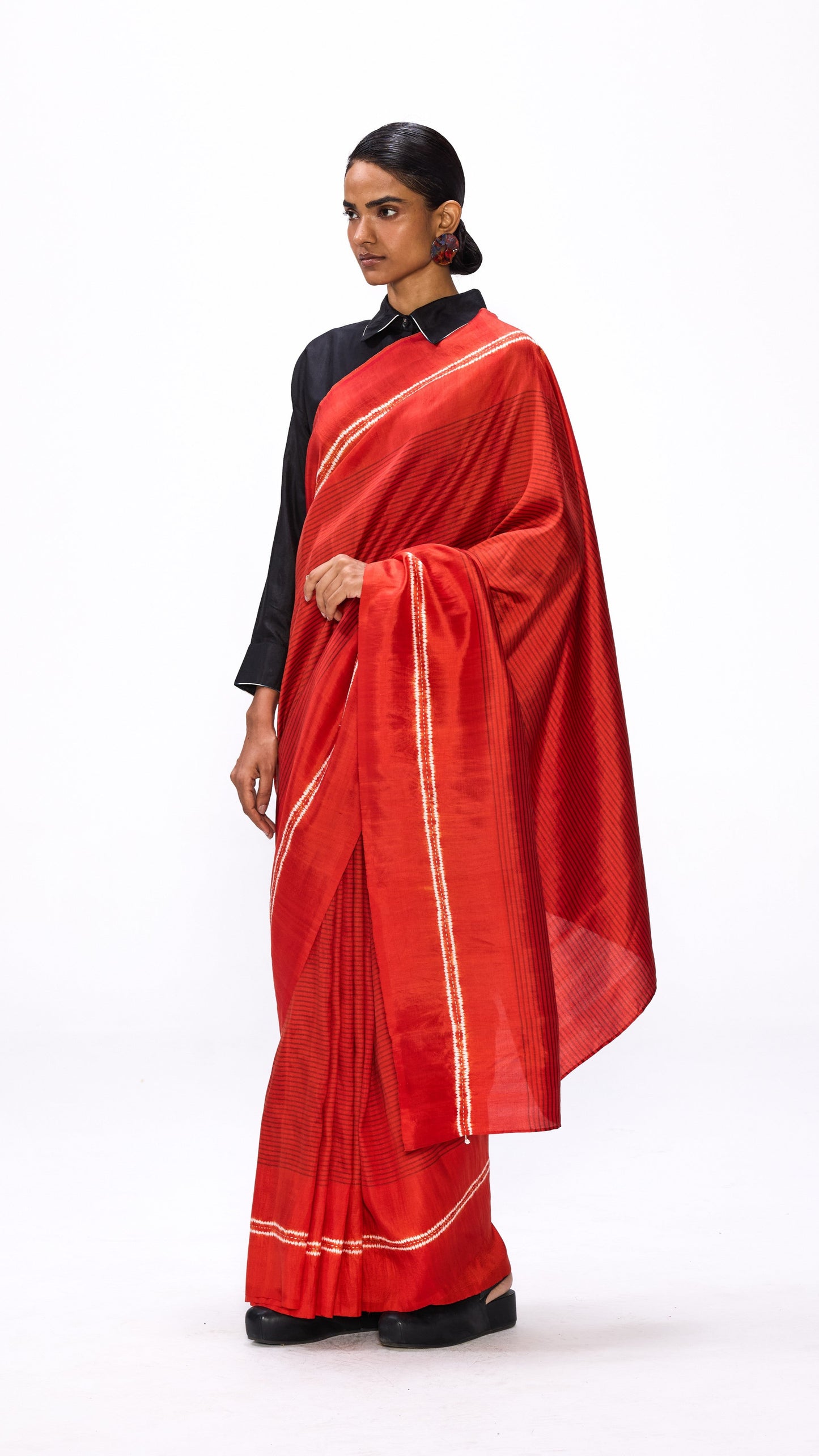 Handwoven silk striped saree with a shibori border detailed with hand embroidered gota and a delicate cluster of beads. It comes with an unstitched rust silk blouse piece.