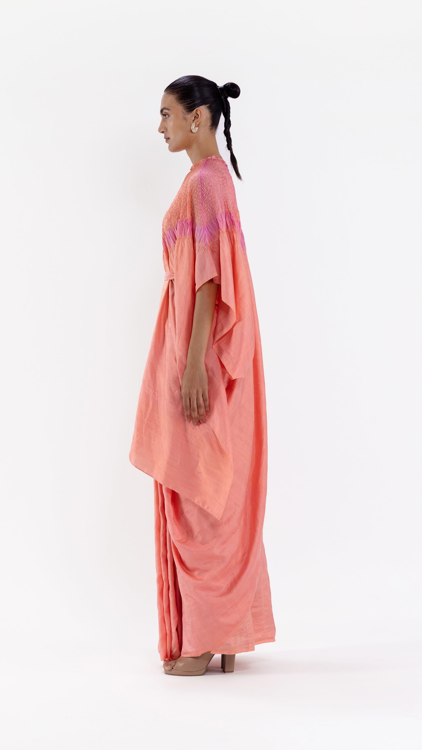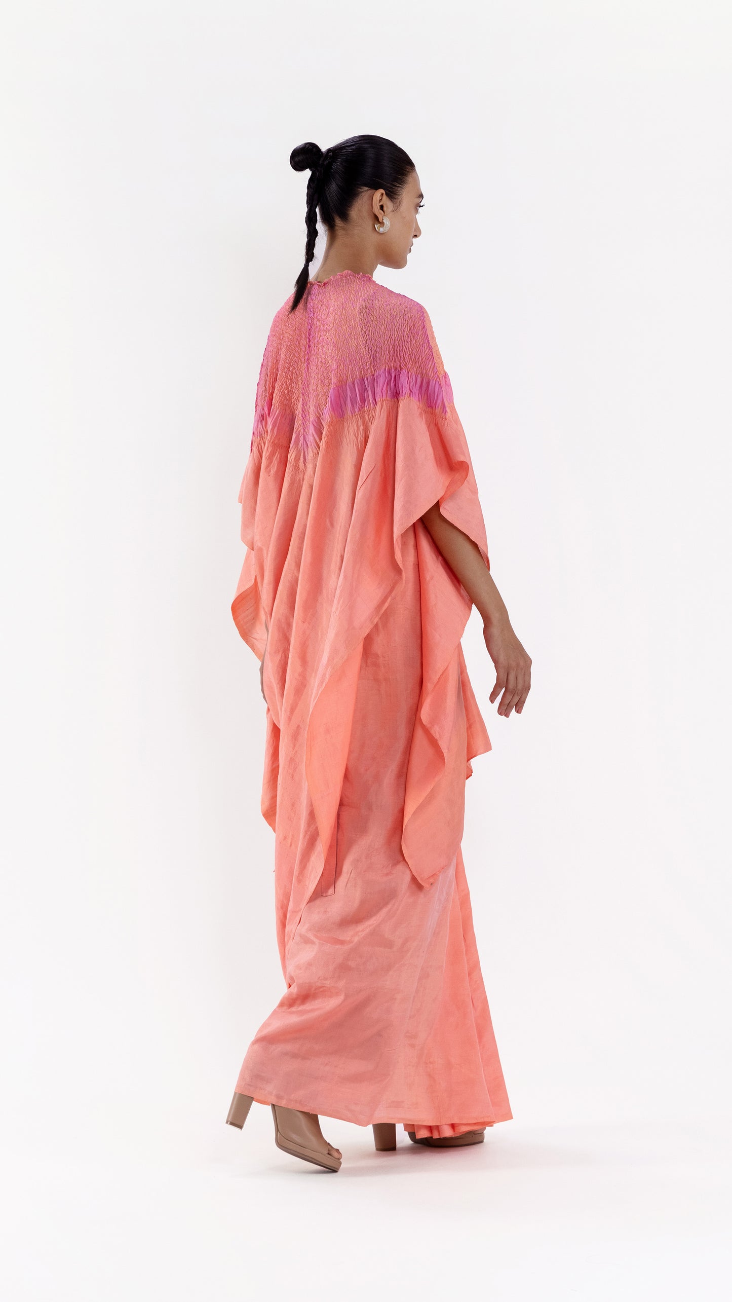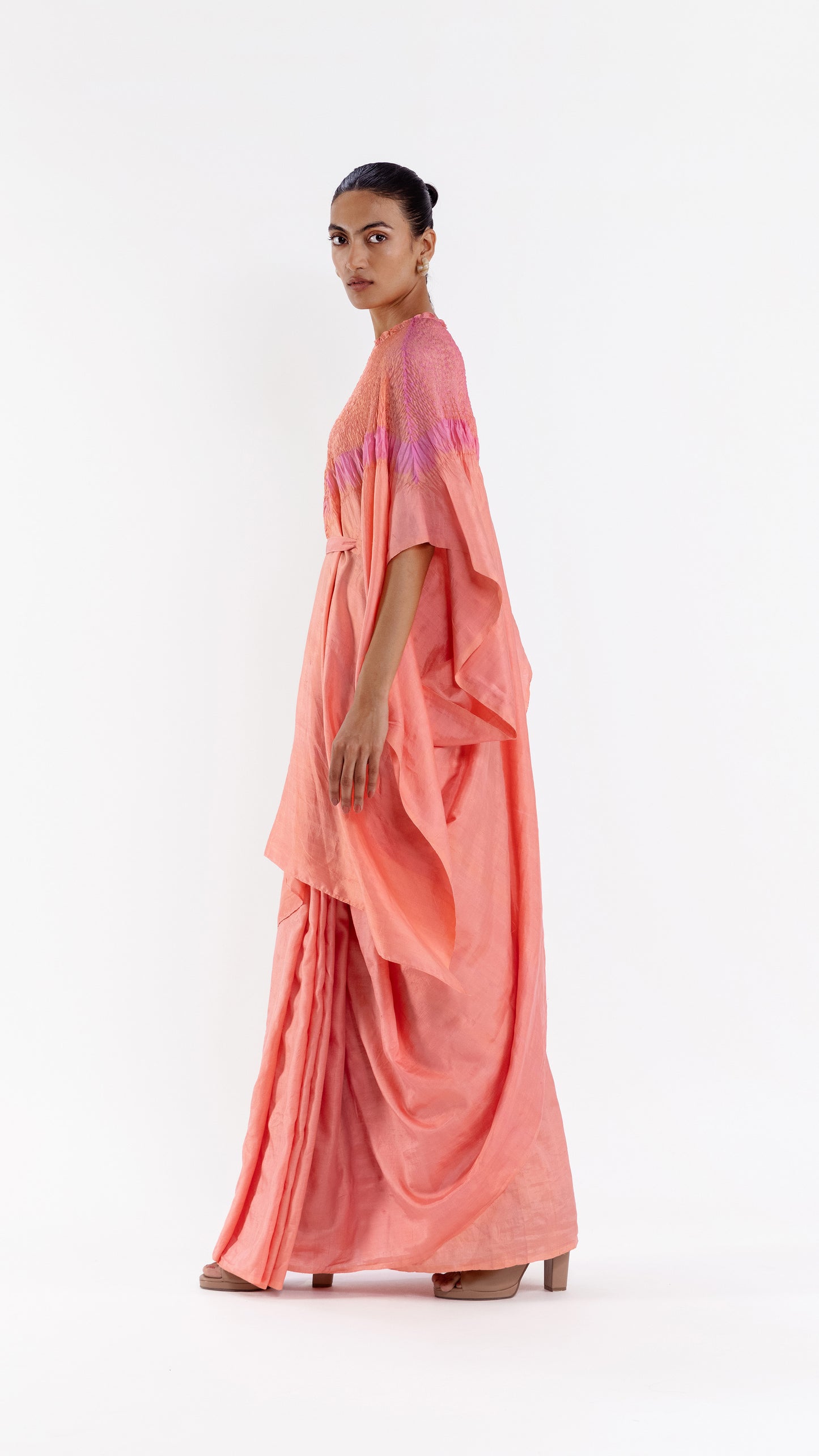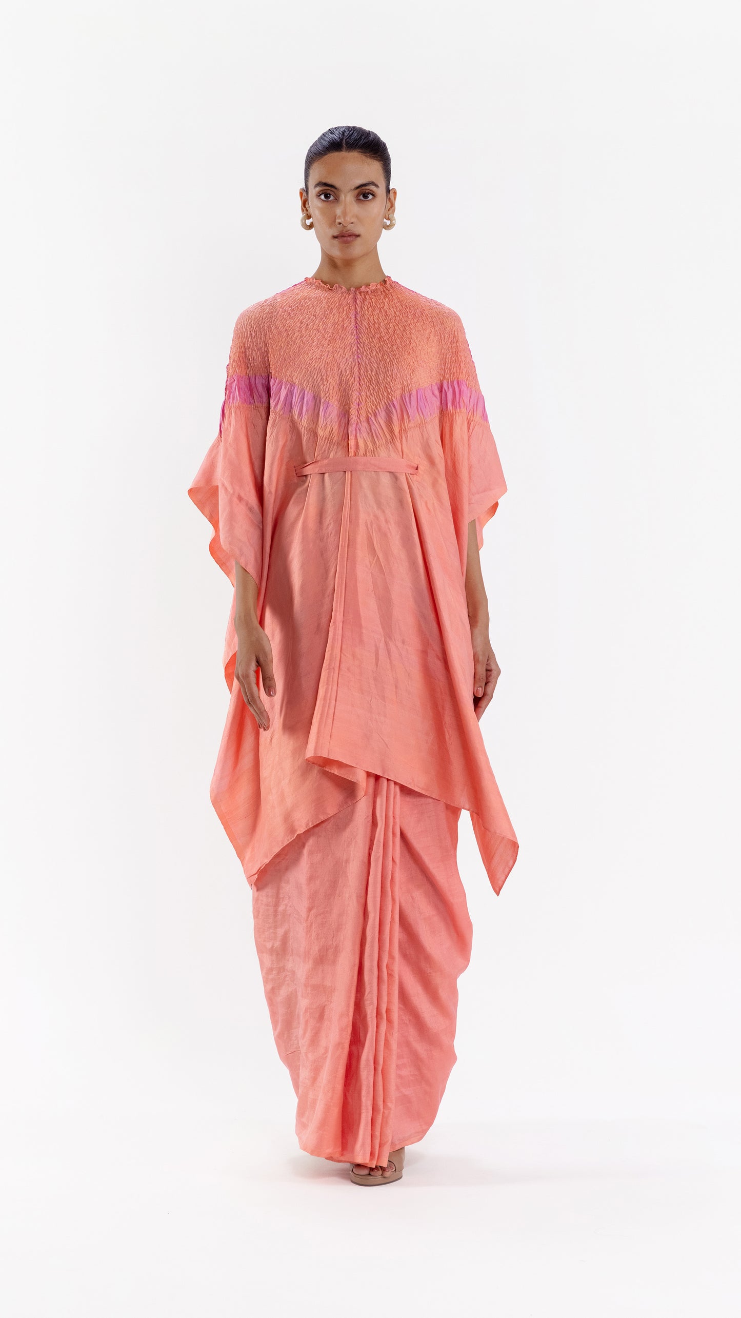 Handwoven saree dyed in pink with our signature shibori detail on the neckline. It comes with an unstitched pink silk blouse piece and a textile belt for the waist.