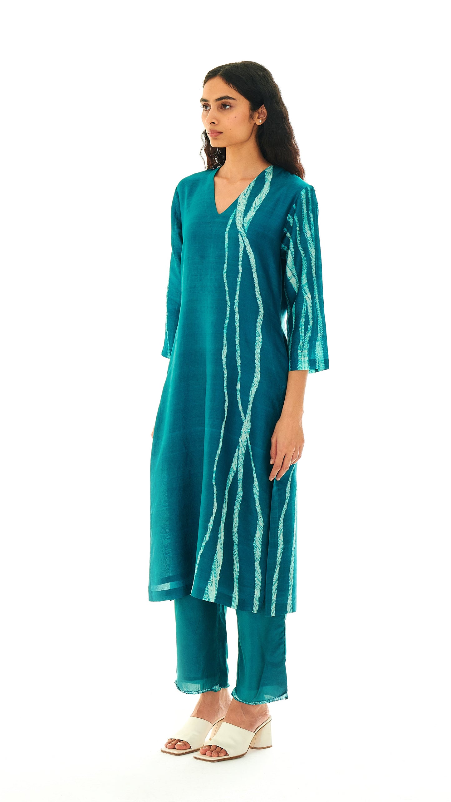 A hem detail created using guntai shibori introduces a subtle root-like pattern at the base of the garment.