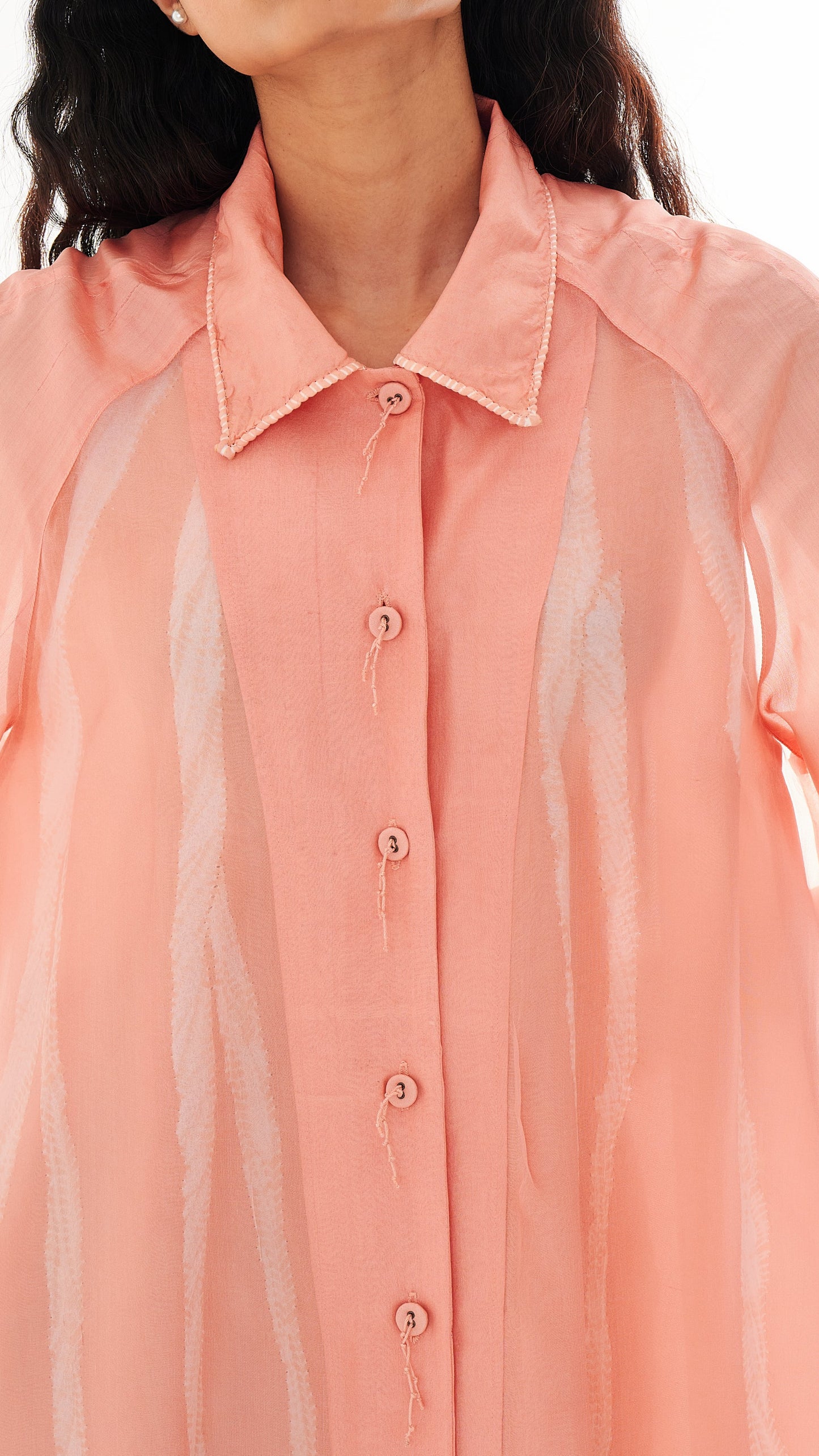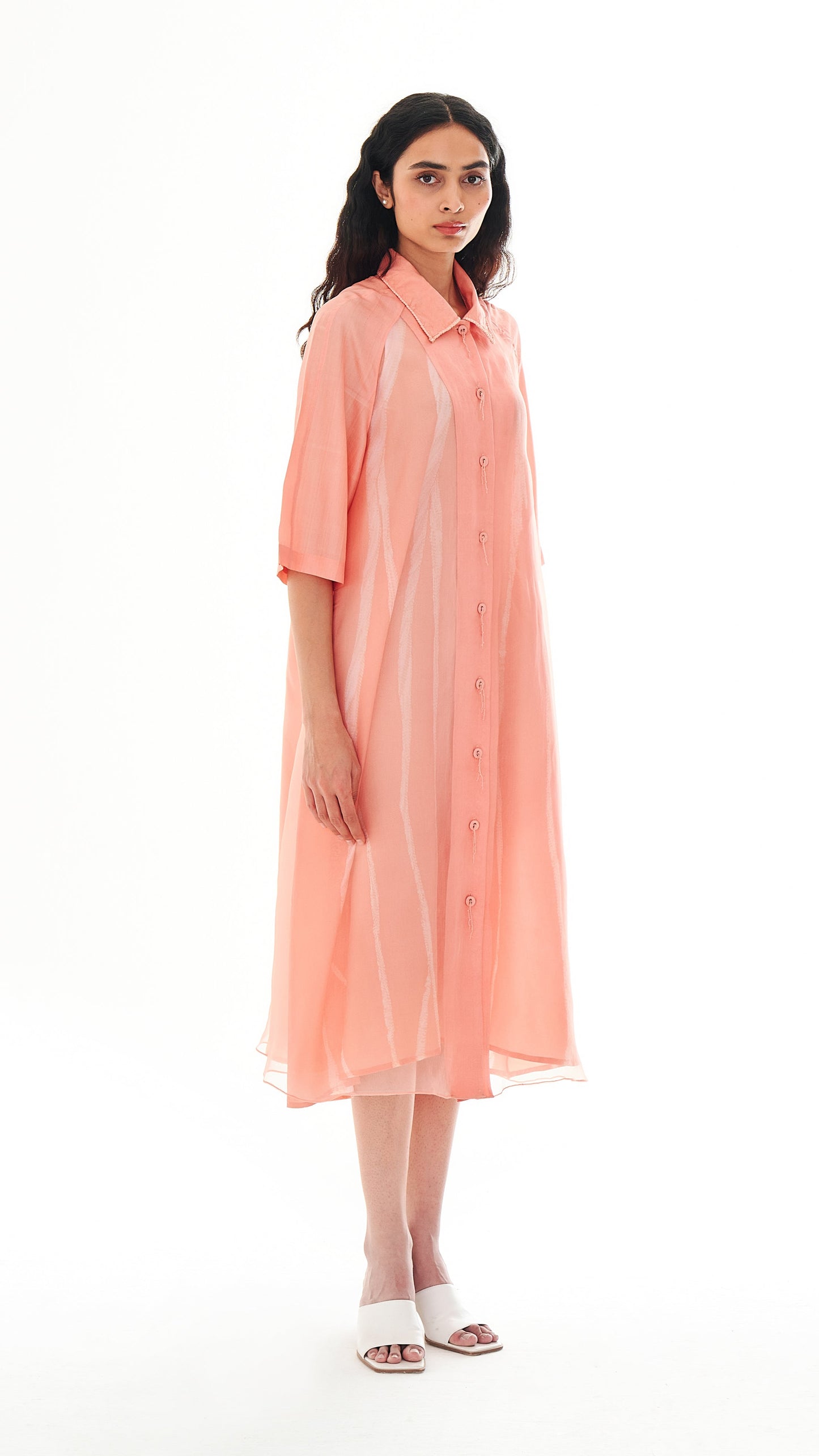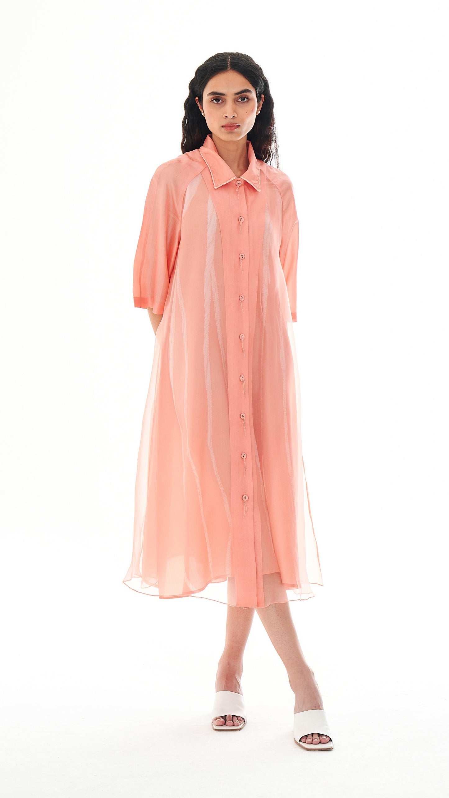 The garment is a set of two pieces. A light-as-air silk organza outer layer features a guntai shibori–detailed collar and buttons with root-inspired accents. It is paired with an elegant A-line slip dress carrying root motifs that run from top to bottom.