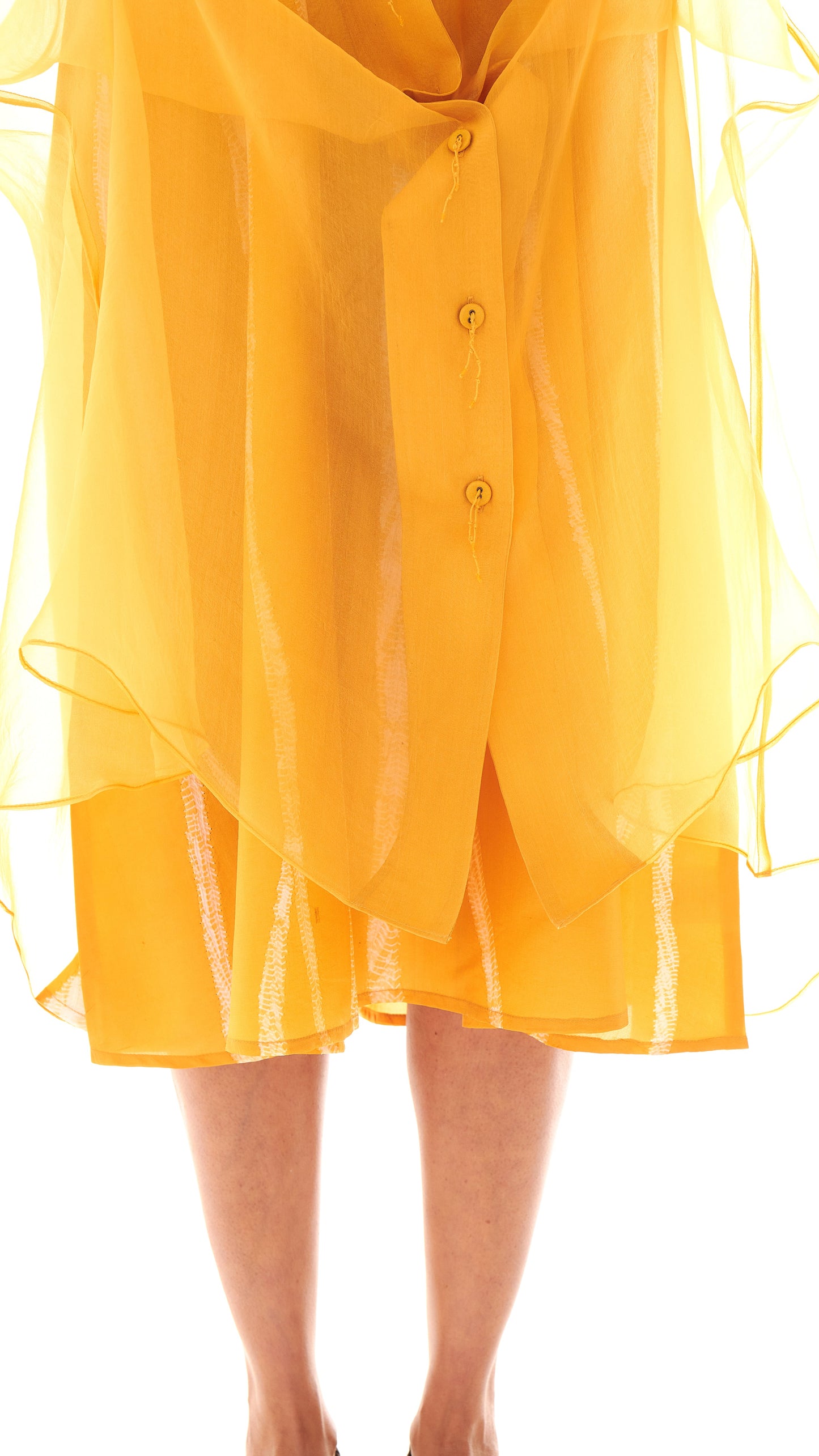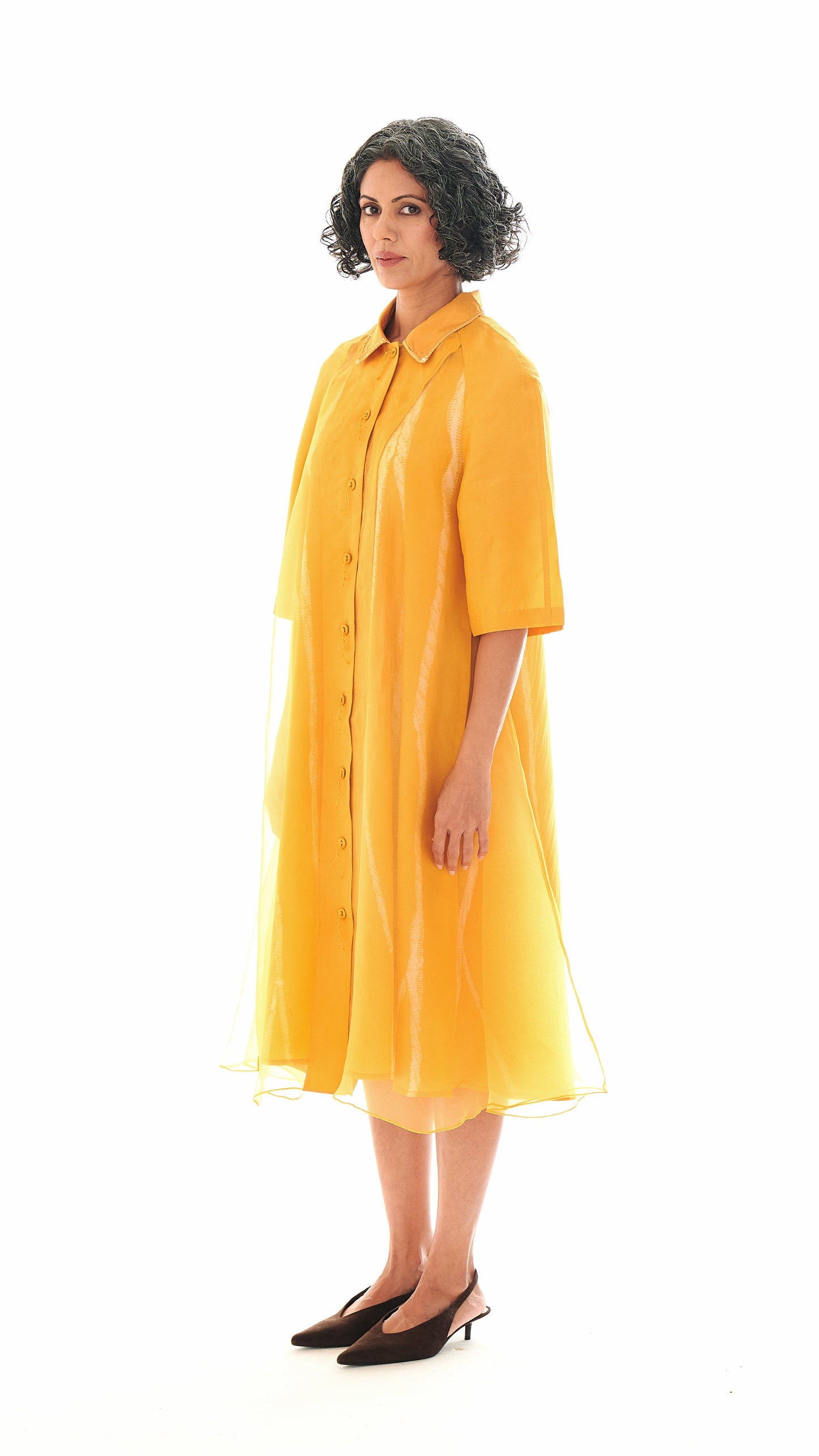 The garment is a set of two pieces. A light-as-air silk organza outer layer features a guntai shibori–detailed collar and buttons with root-inspired accents. It is paired with an elegant A-line slip dress carrying root motifs that run from top to bottom.