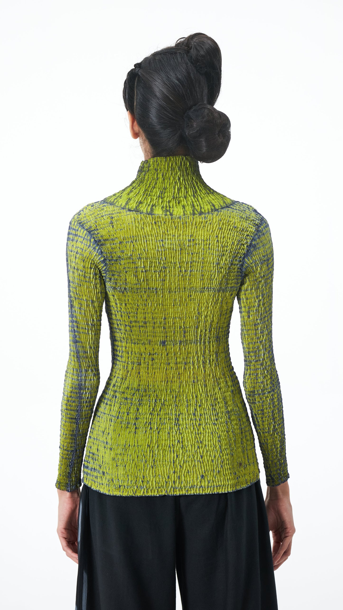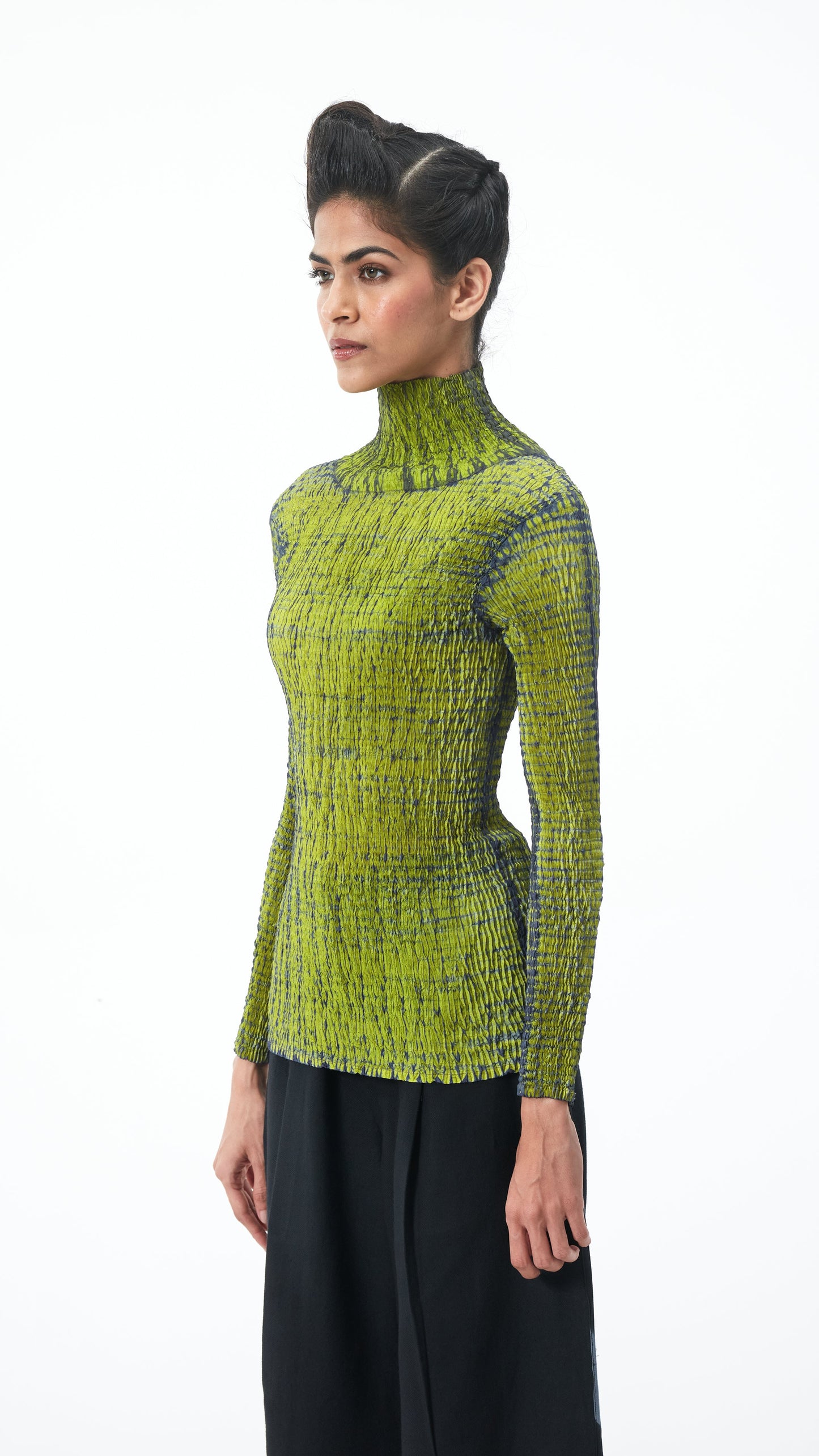 A sculptural take on a skivi achieved through hand crafted shibori, this high neck top features fluid texture that contours your form. Crafted in Silk and dyed in shades of grey and lime, it adds depth to your look making it an easy to style staple. Made in silk.