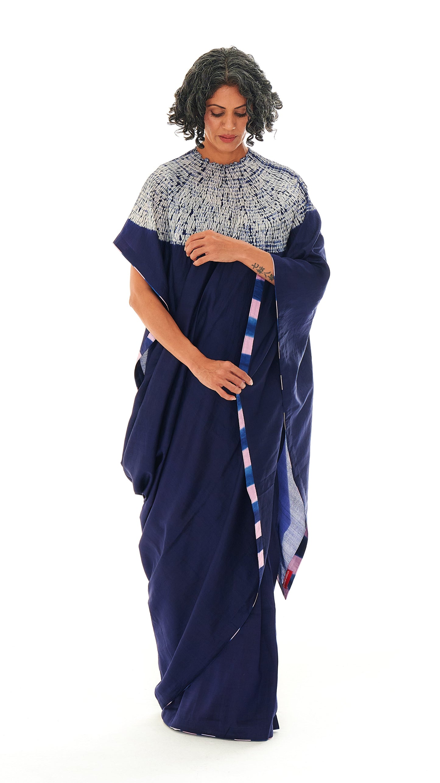Handwoven saree dyed in navy with our signature shibori detail on the neckline, finished with an itajime facing. It comes with an unstitched navy silk blouse piece.