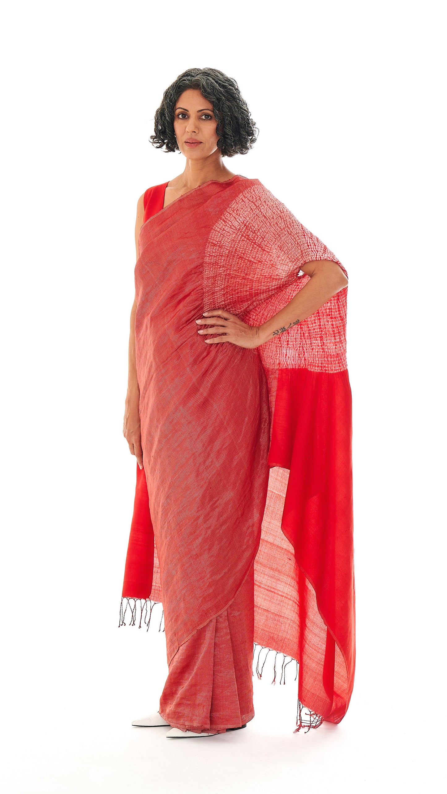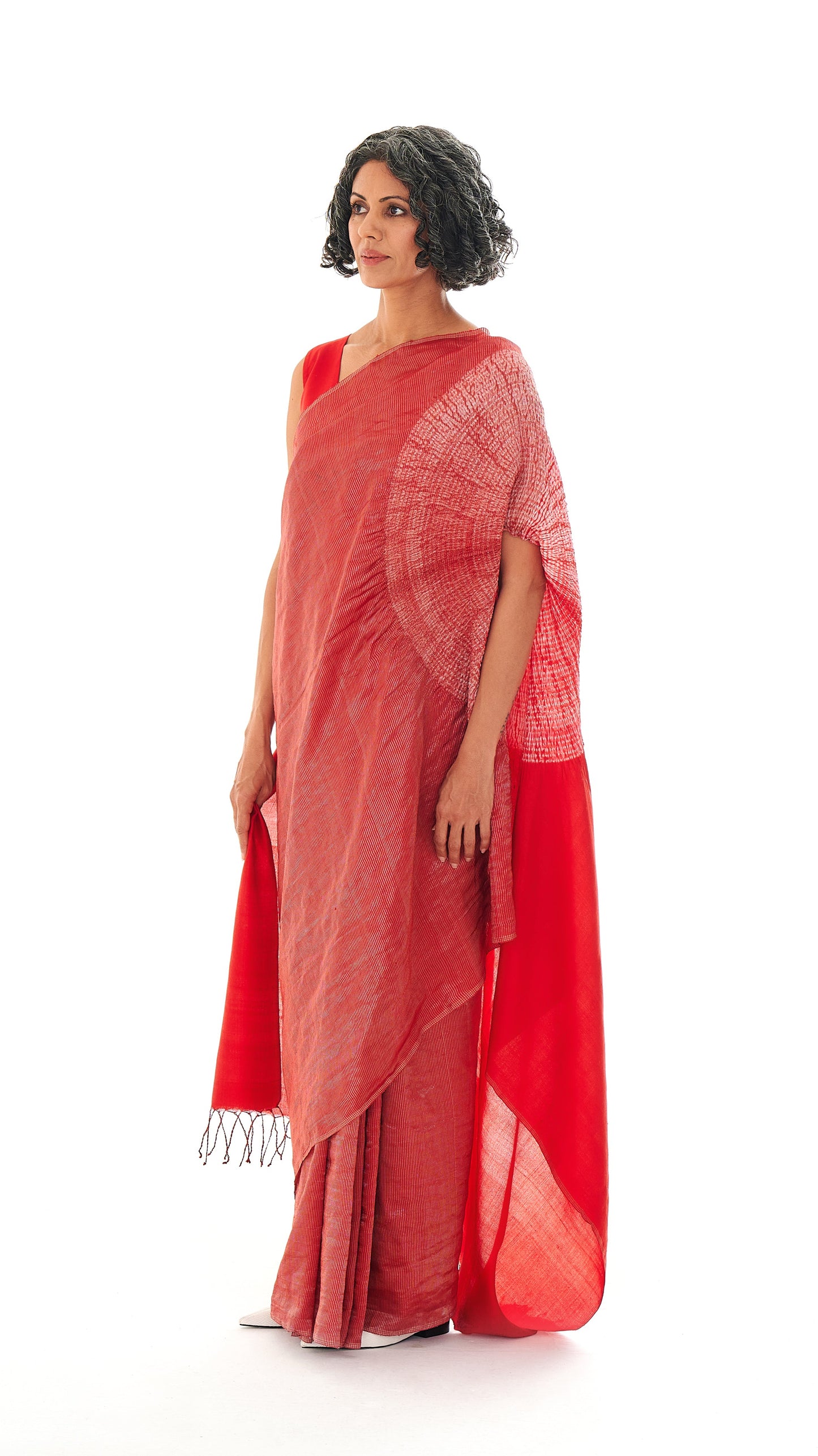Handwoven striped metallic handsfree saree dyed in red with our signature shibori sleeve detail on the pallav. It comes with an unstitched red silk blouse piece.