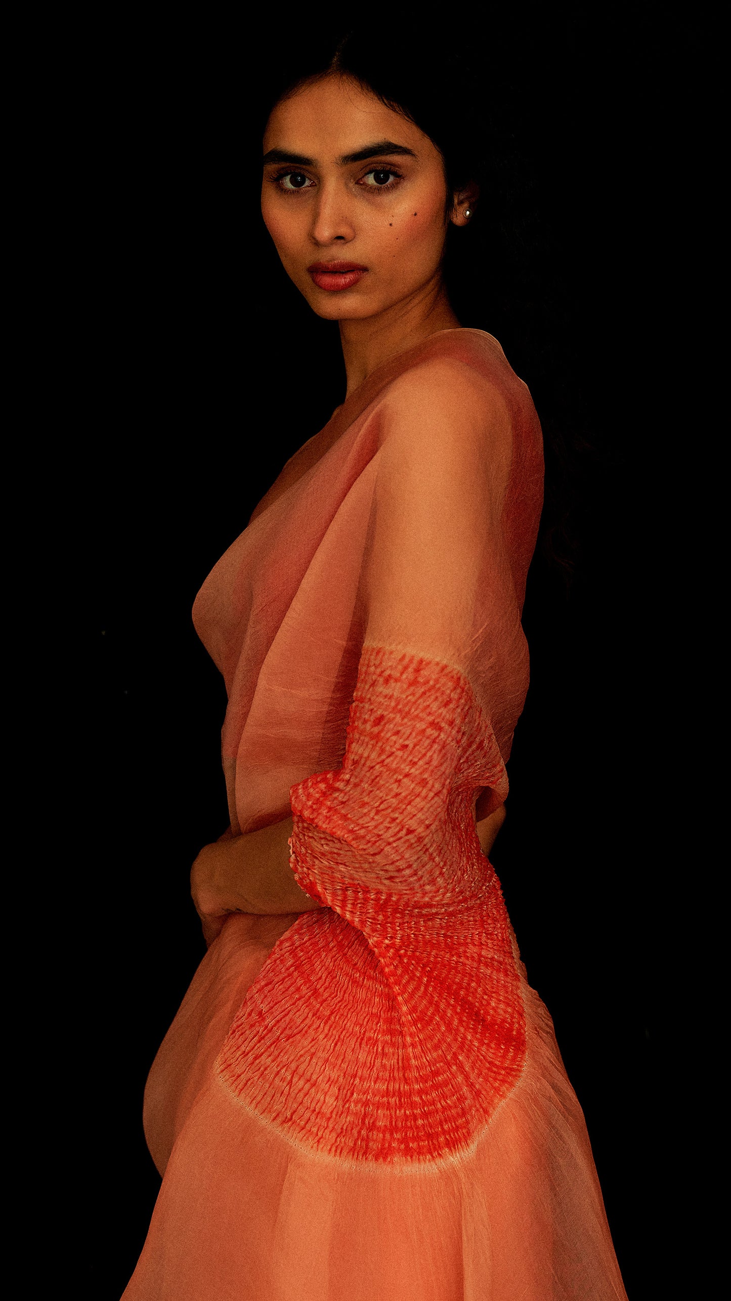 Silk organza saree hand-dyed in Mineral Peach, with an engineered shibori sleeve on the pallav dyed in Clay. The saree comes with an unstitched silk blouse piece.
