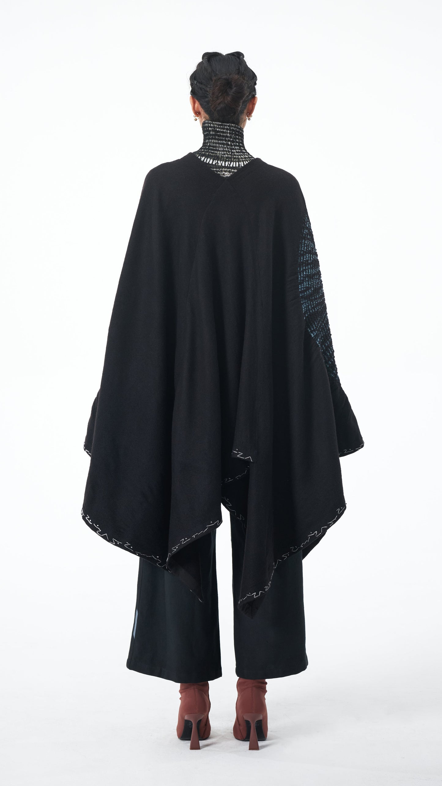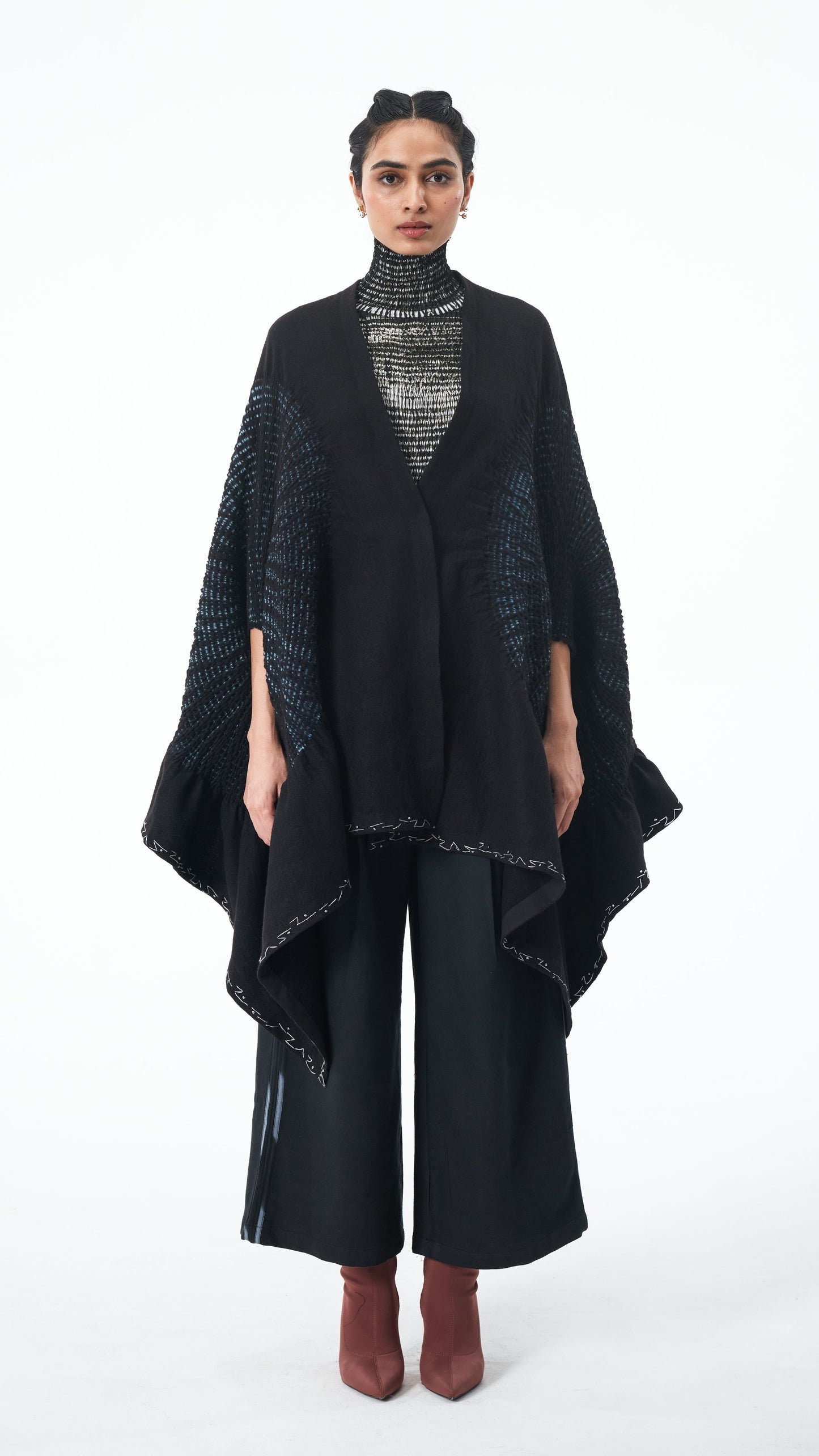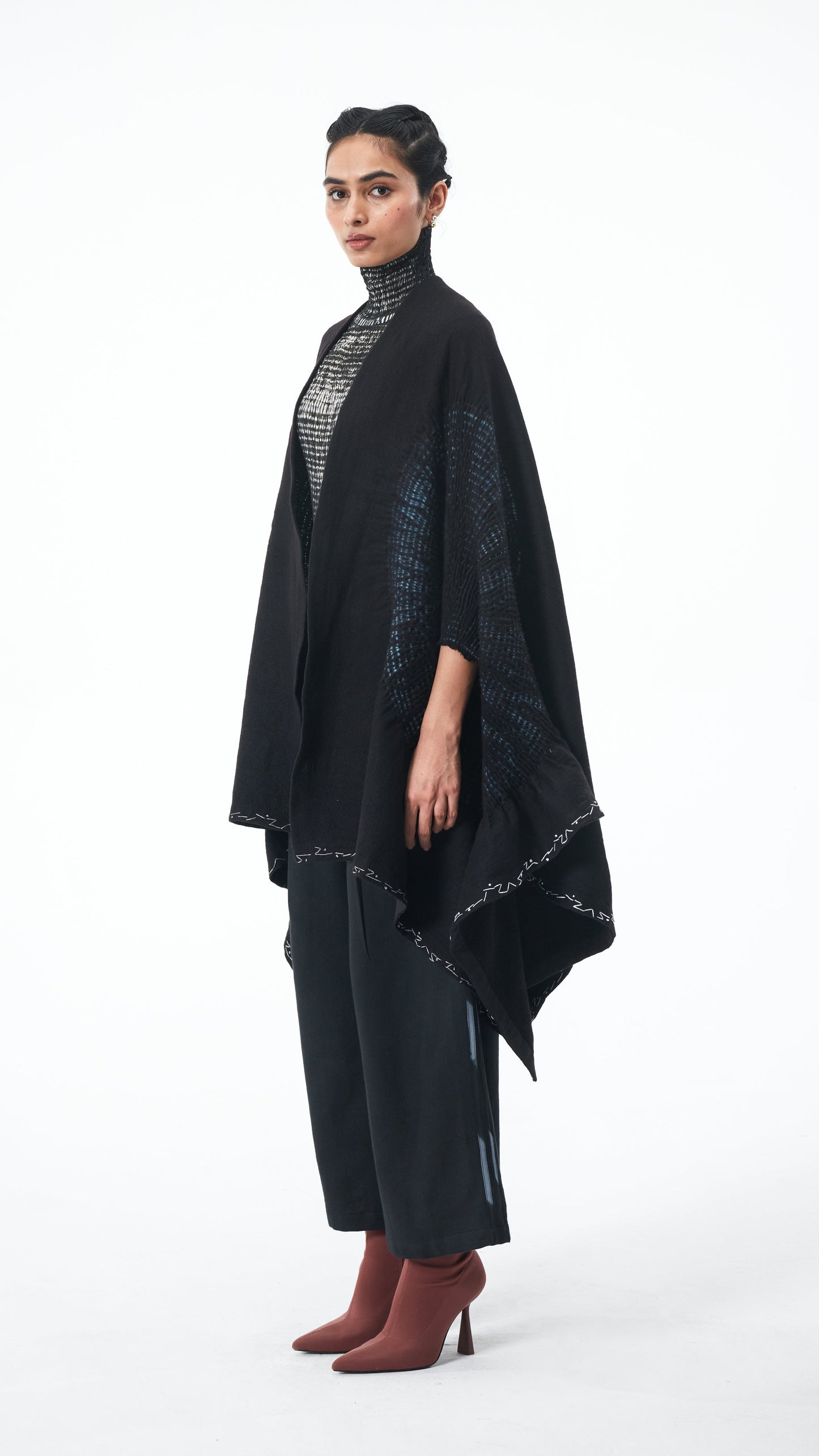 Assymterical cape featuring our signature shibori sleeve, dyed in classic black. The cape has embroidery detailing on the hem adding to the style, making it a staple to layer with any silhouette.