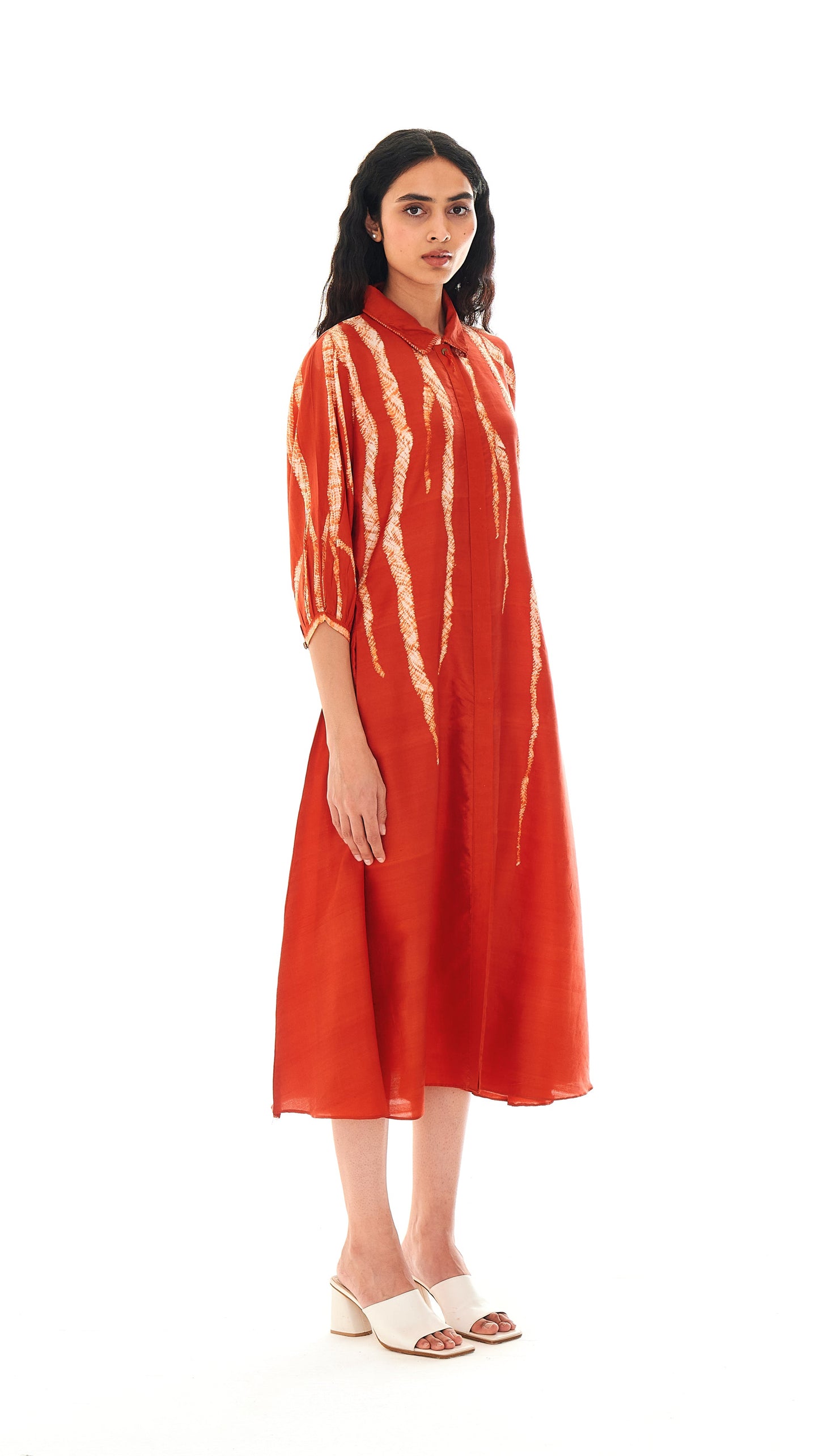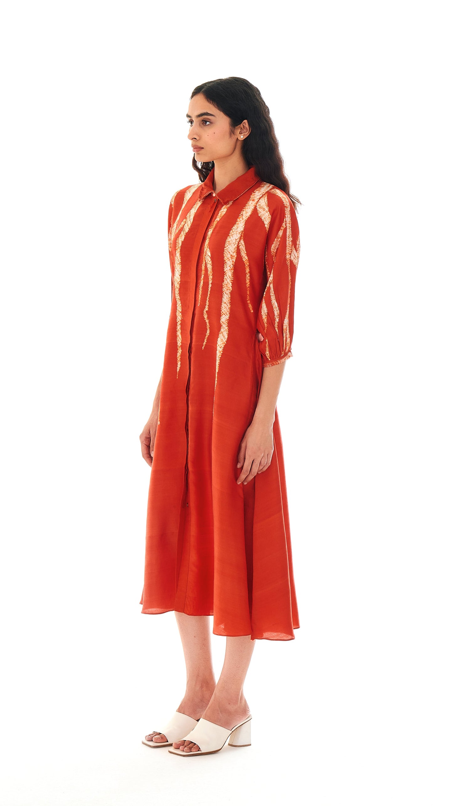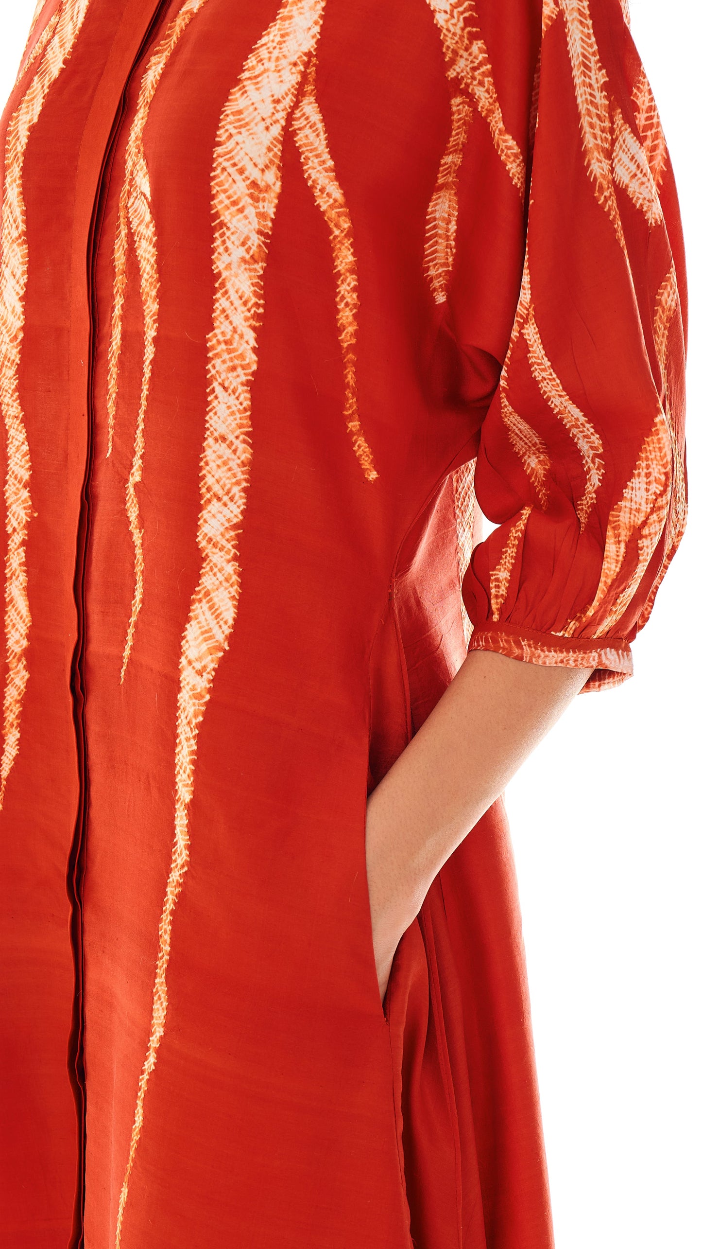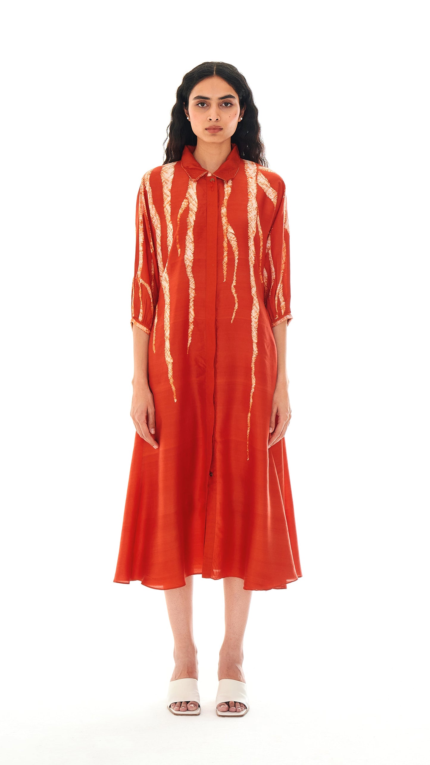 It features a concealed placket and guntai shibori detailing on the cuffs that add texture to the construction. The top button features a root-like tassel, a detail that appears across the collection.
