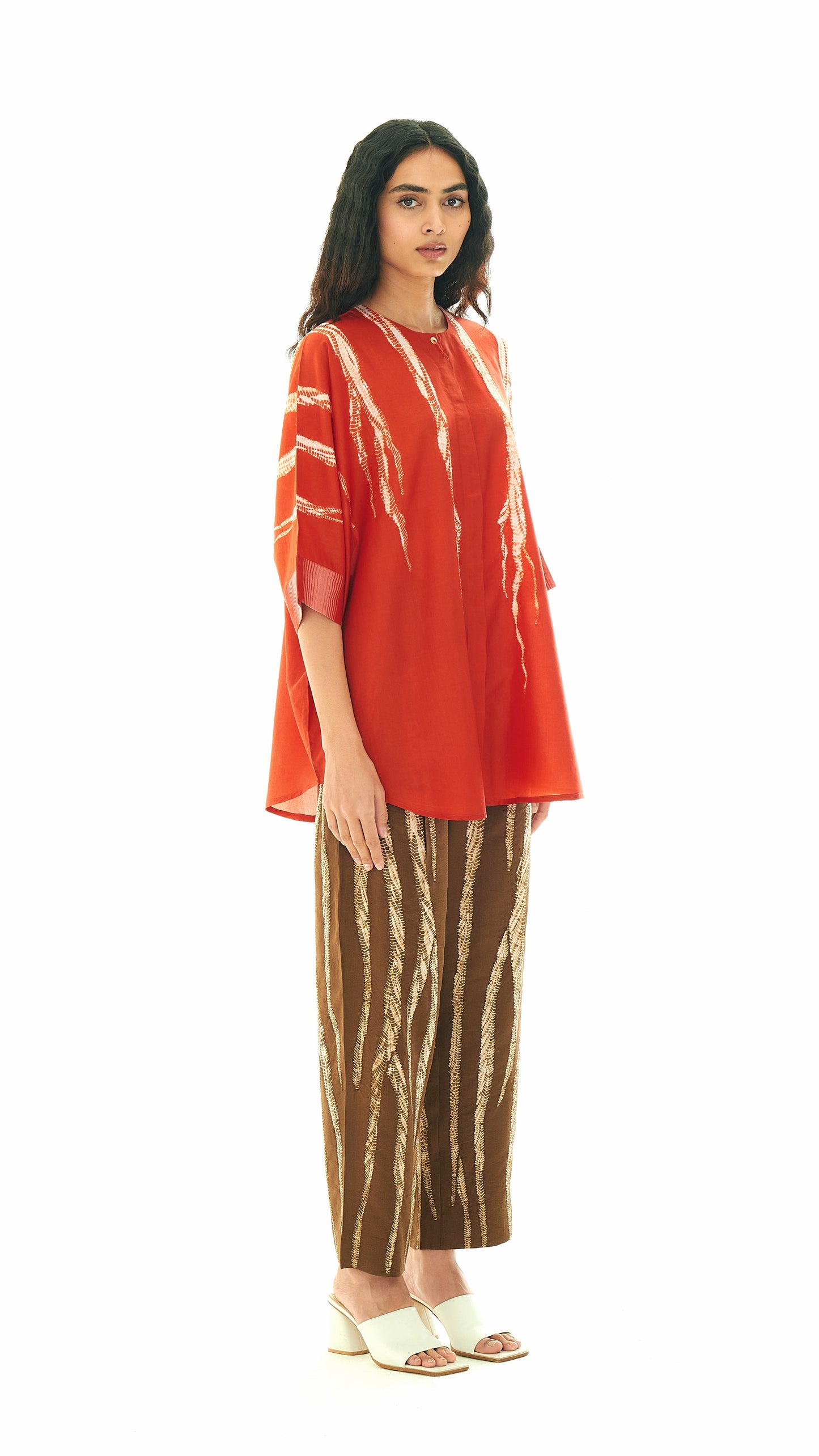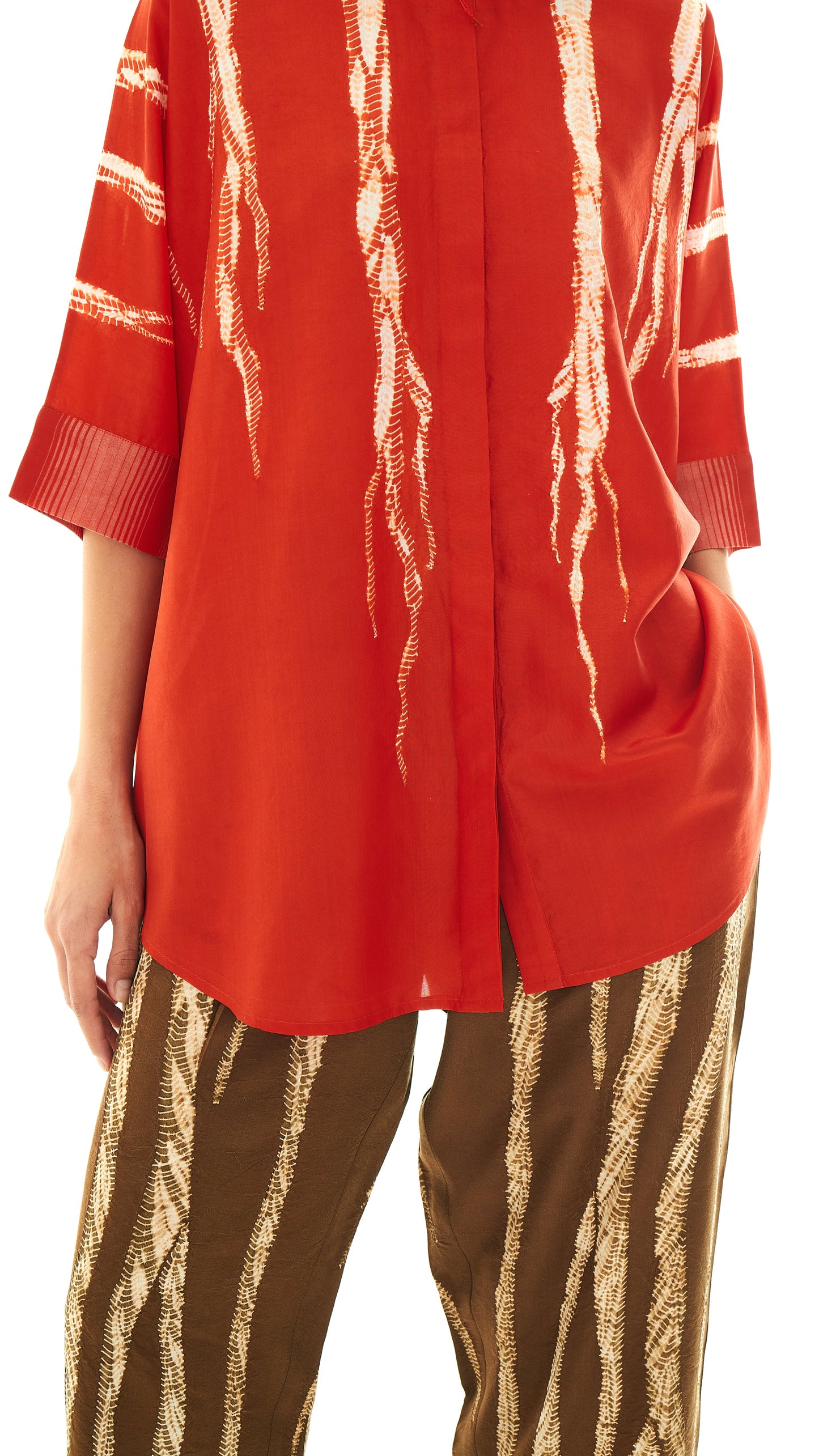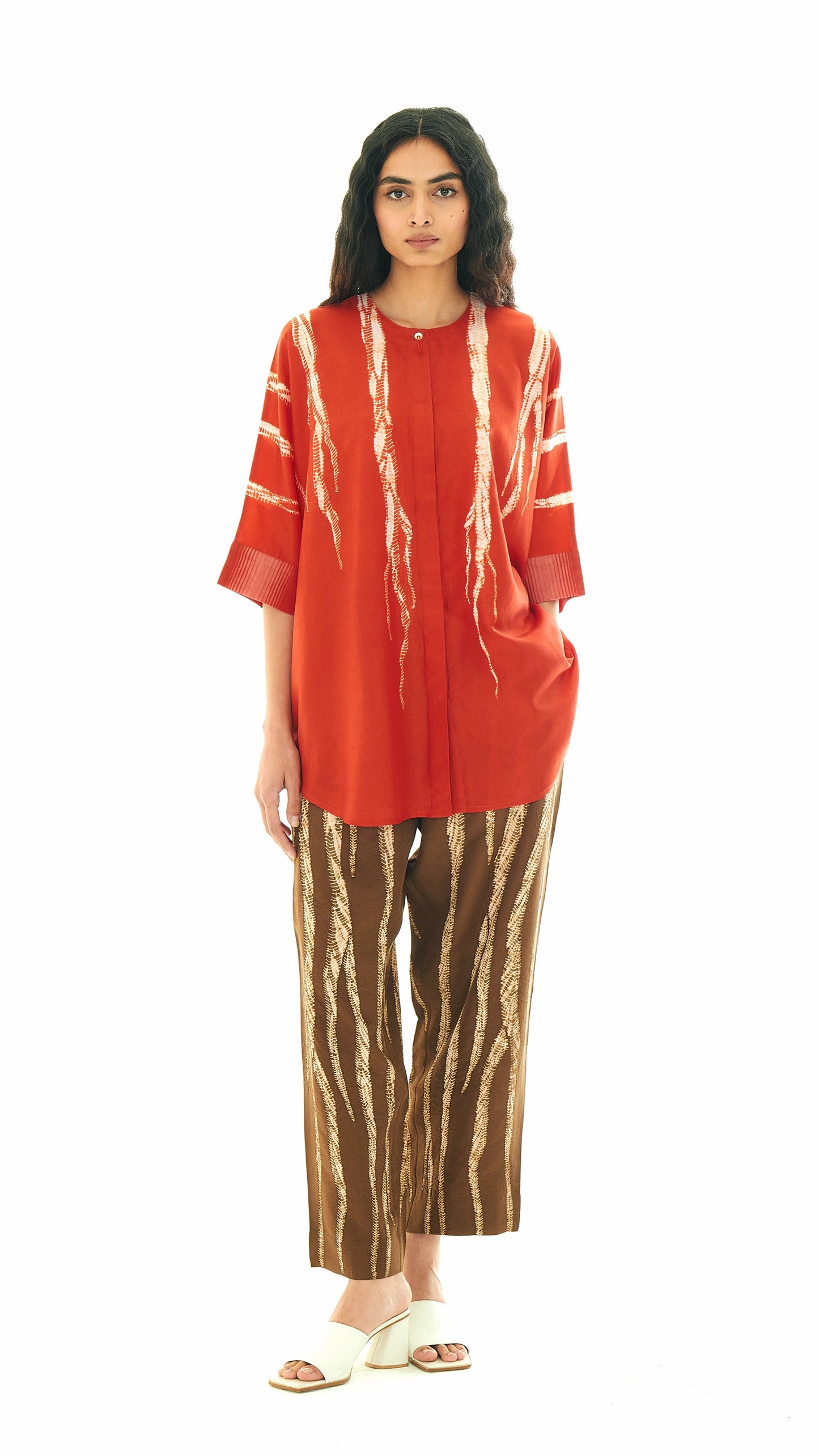 This shirt is Studio Medium’s familiar zero-waste, free-size silhouette. It features a concealed placket and seersucker cuffs that add texture to the construction. The top button features a root-like tassel, a detail that appears across the collection.