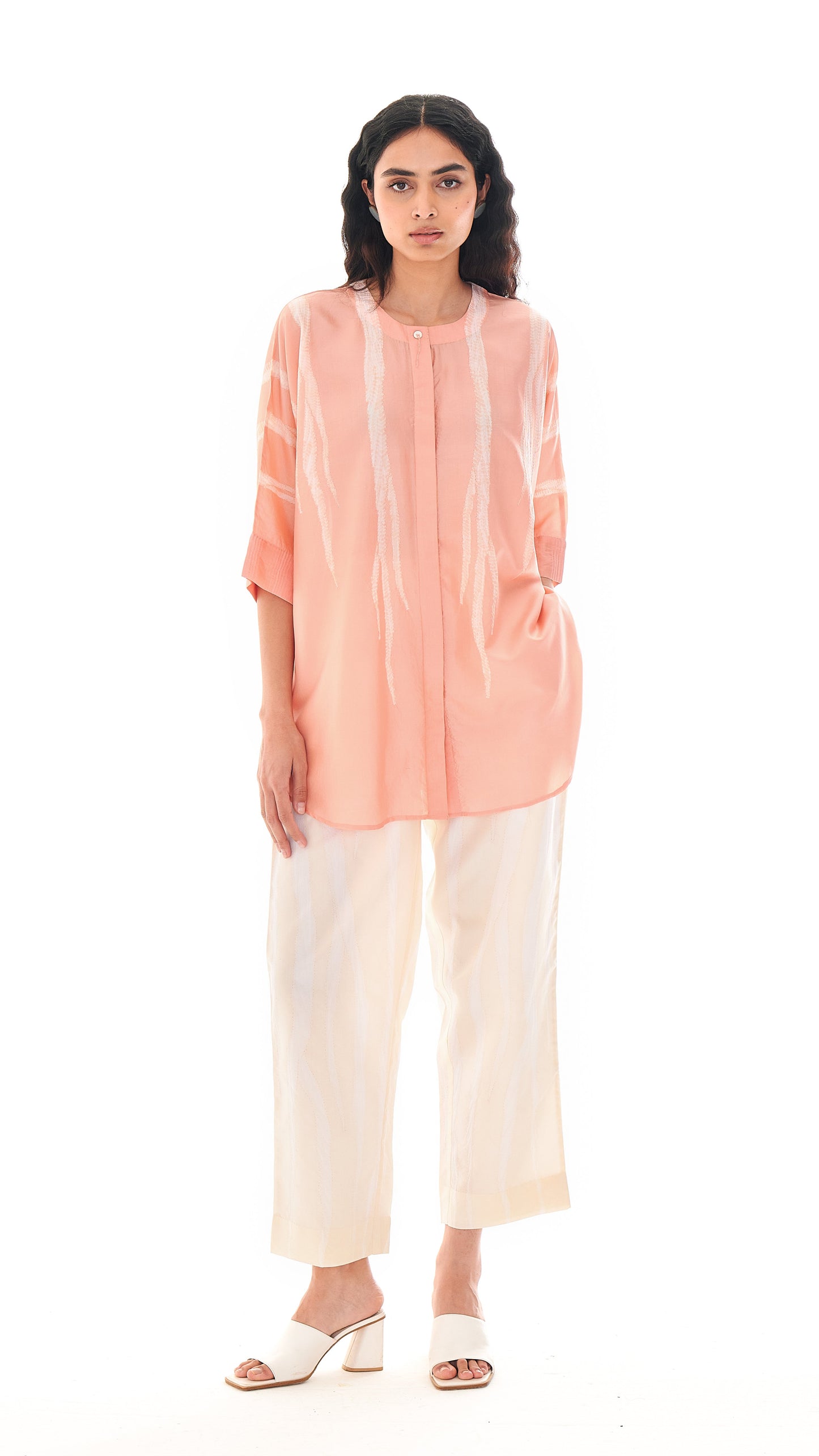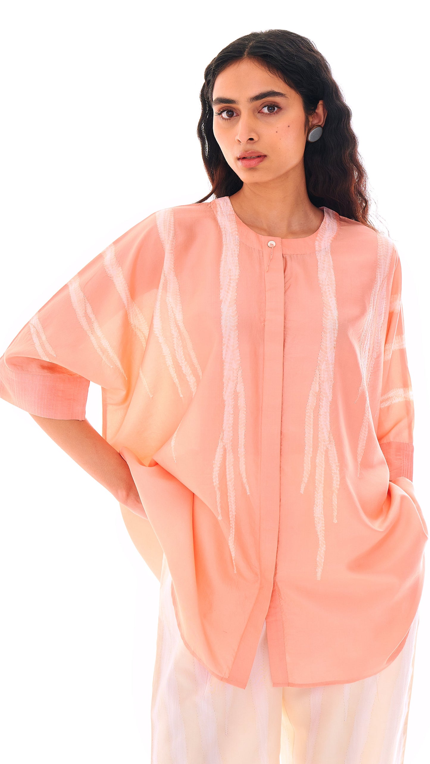This shirt is Studio Medium’s familiar zero-waste, free-size silhouette. It features a concealed placket and seersucker cuffs that add texture to the construction. The top button features a root-like tassel, a detail that appears across the collection.