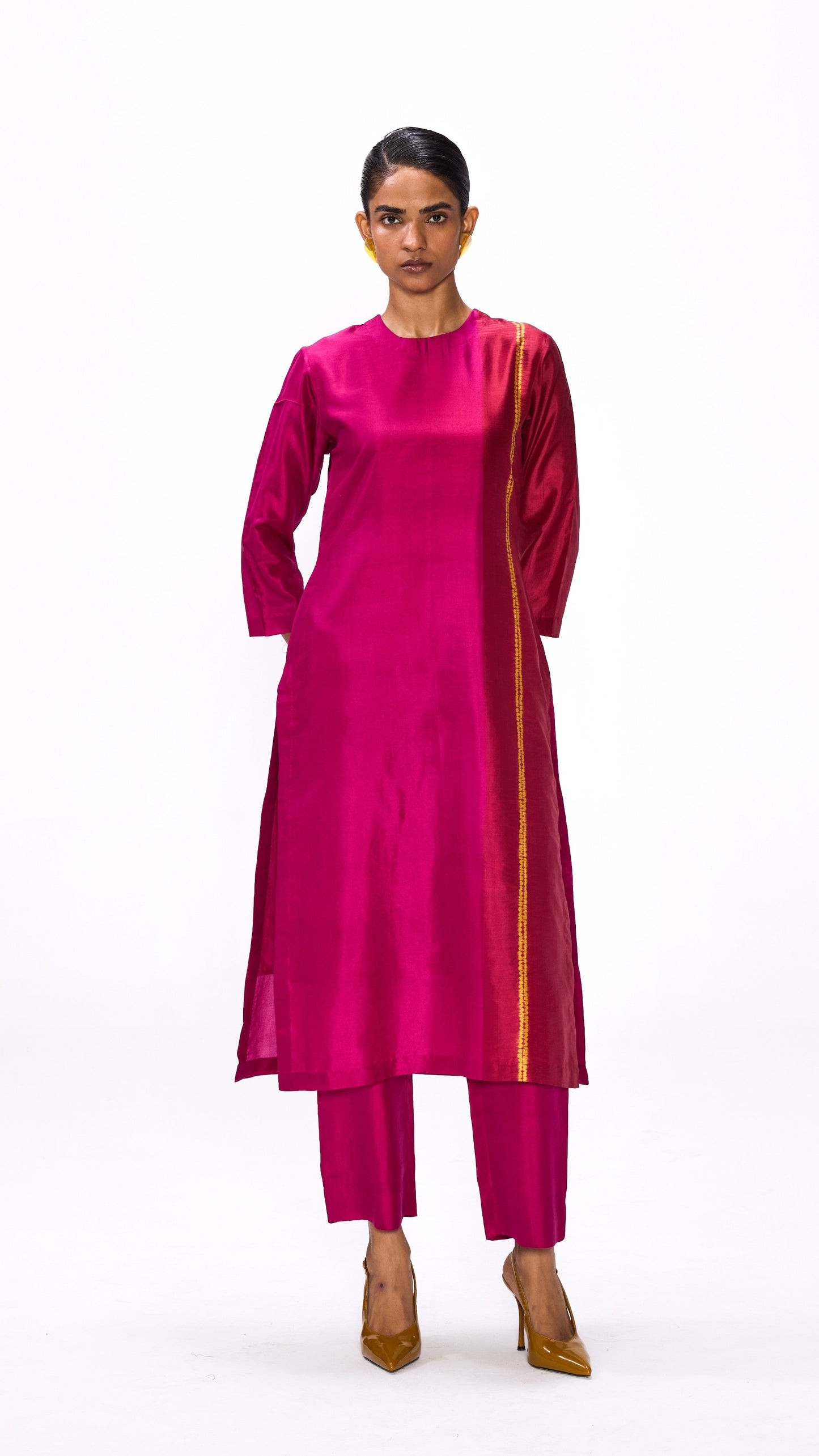 A silk colour block kurta in the shades of magenta with a contrast shibori detail.