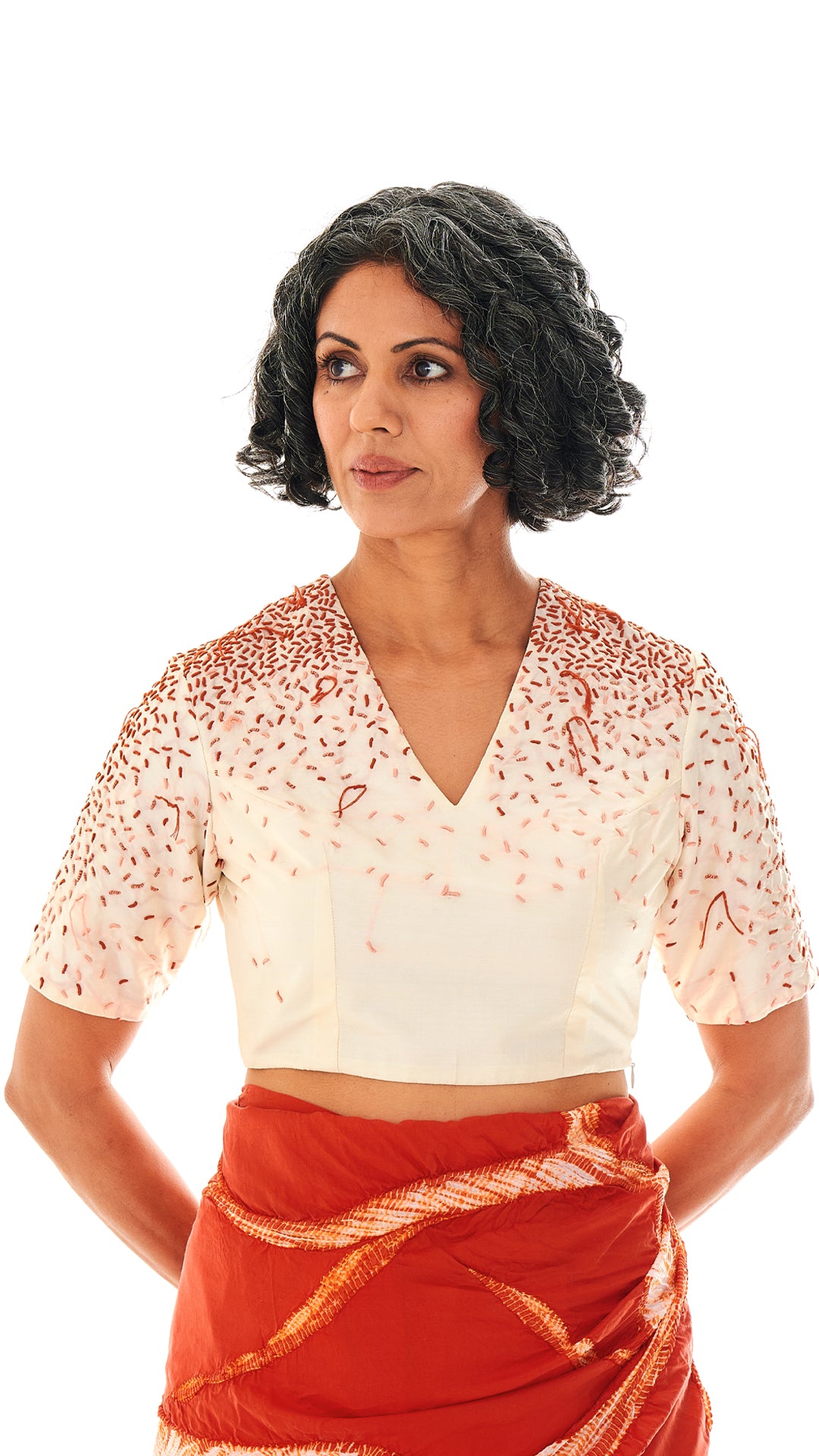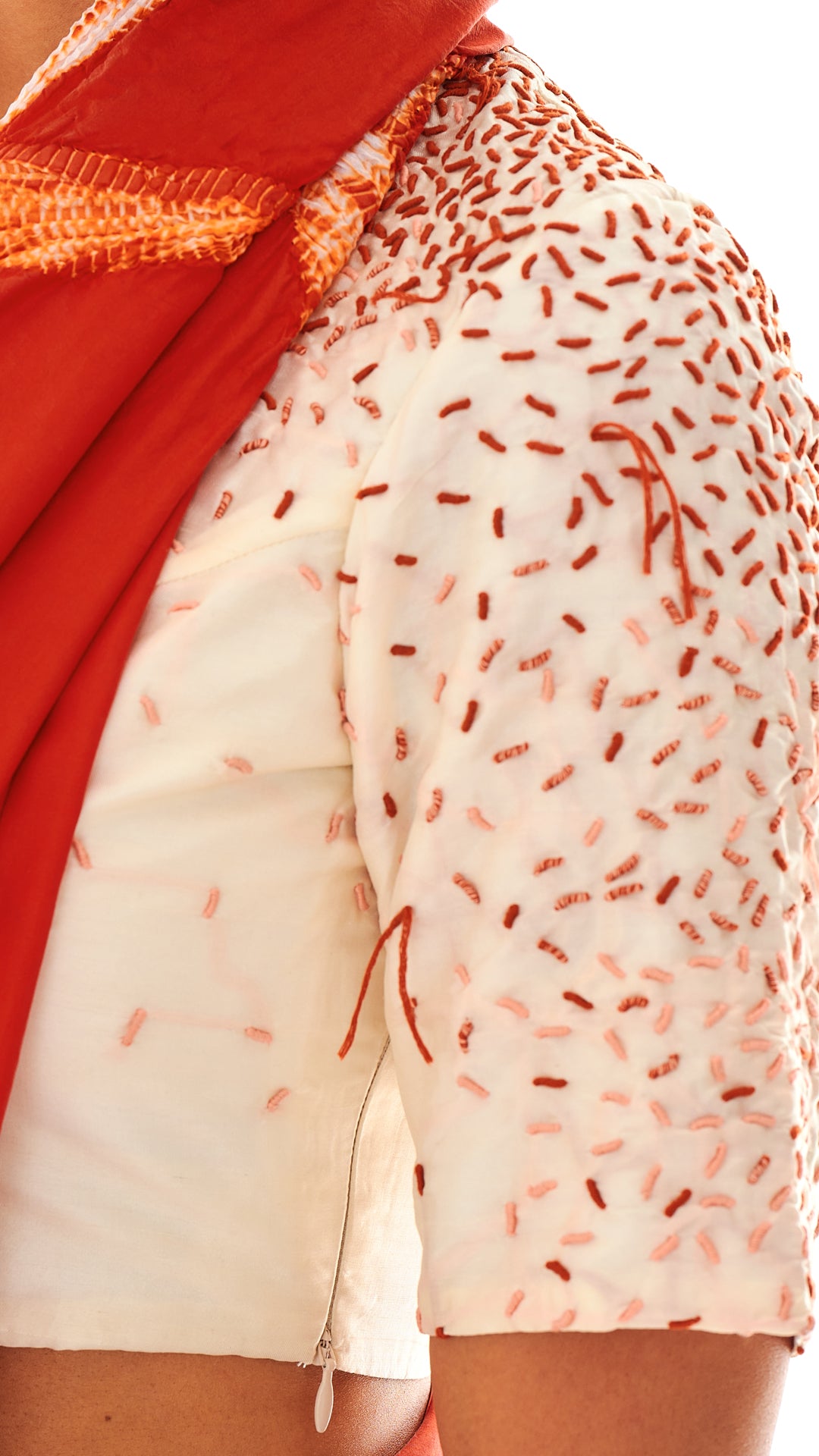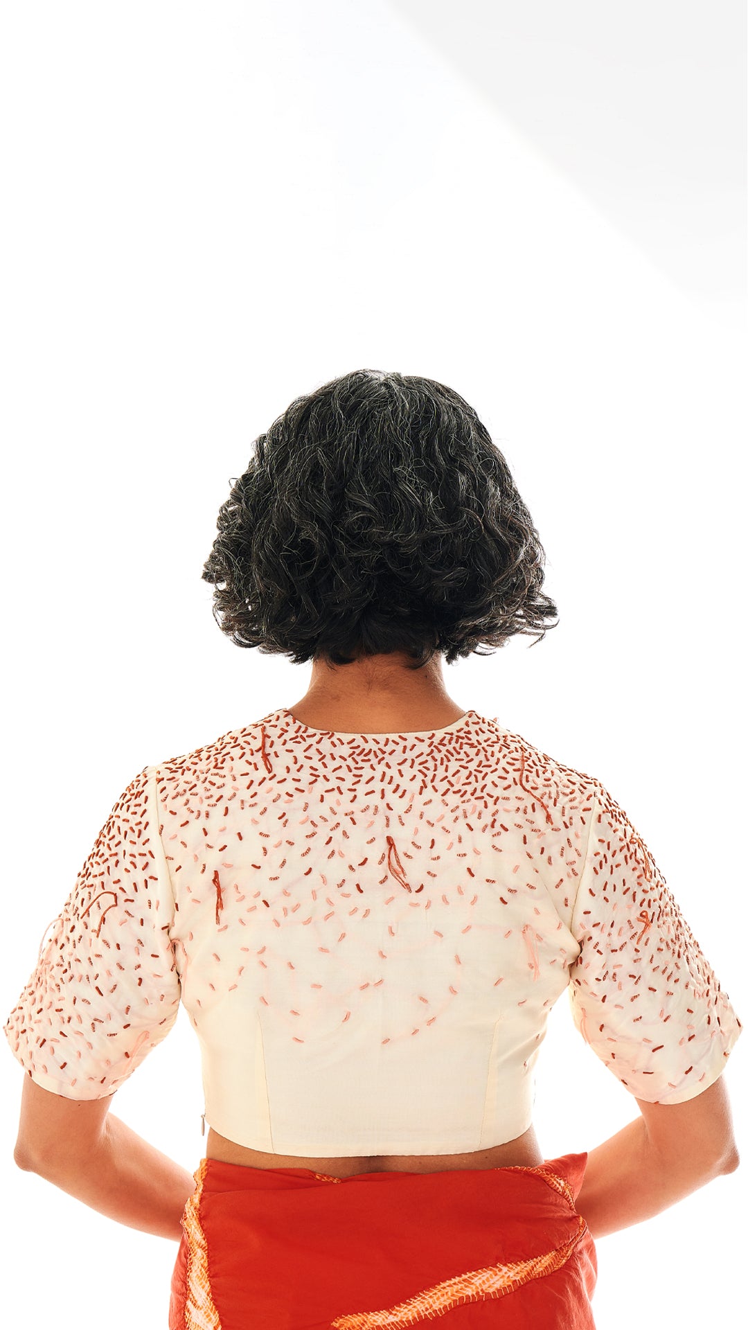 The Radicle Blouse takes its name from the radicle, the first root that emerges from a germinating seed. The garment features subtle embroidery that reads like fine root lines, denser around the shoulders and gradually spacing out as it moves downward. This treatment marks Studio Medium’s exploration of embroidery as a surface technique, interpreted through fine root-like lines.