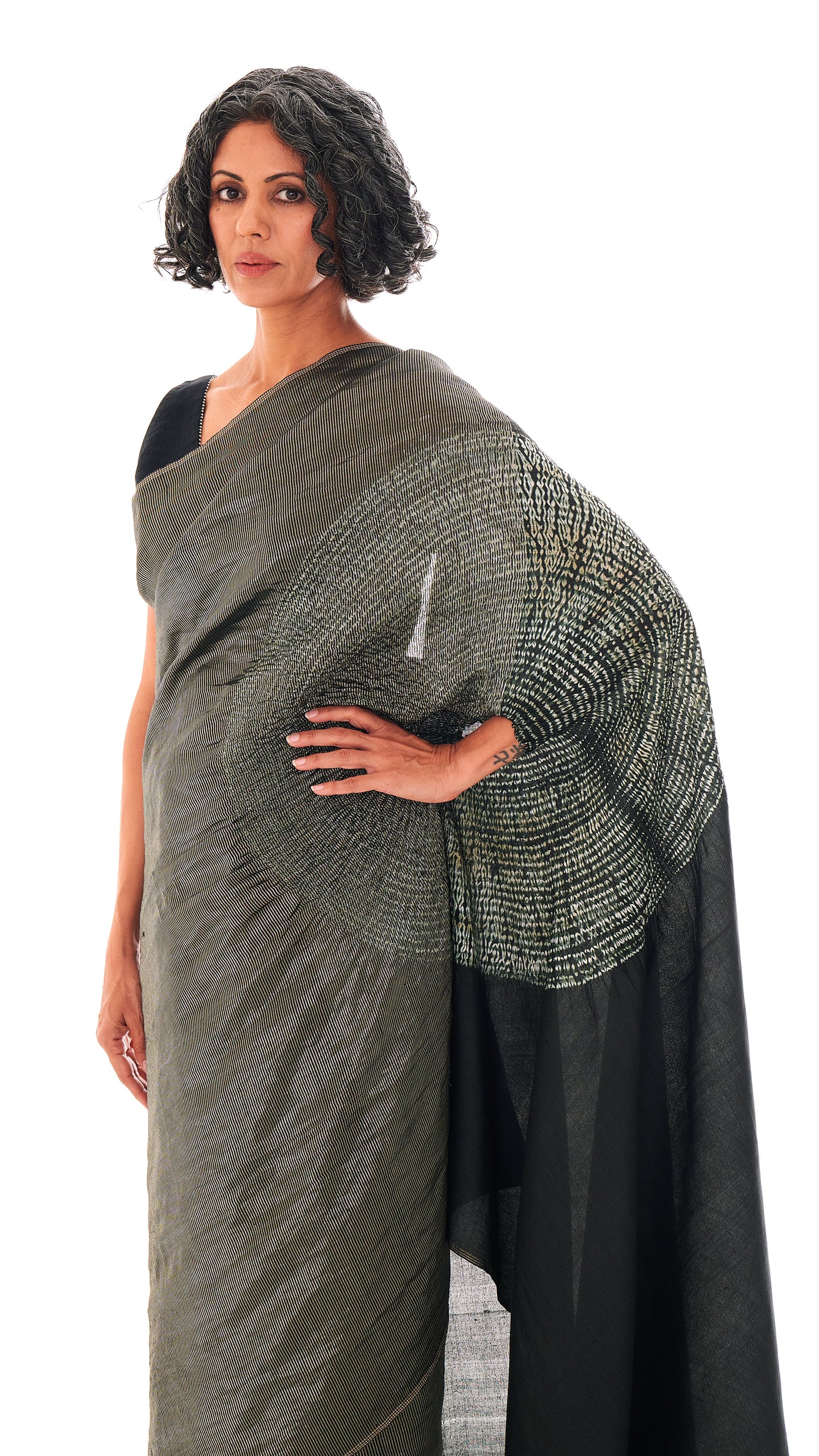Handwoven striped metallic handsfree saree dyed in black with our signature shibori sleeve detail on the pallav. It comes with an unstitched black silk blouse piece.