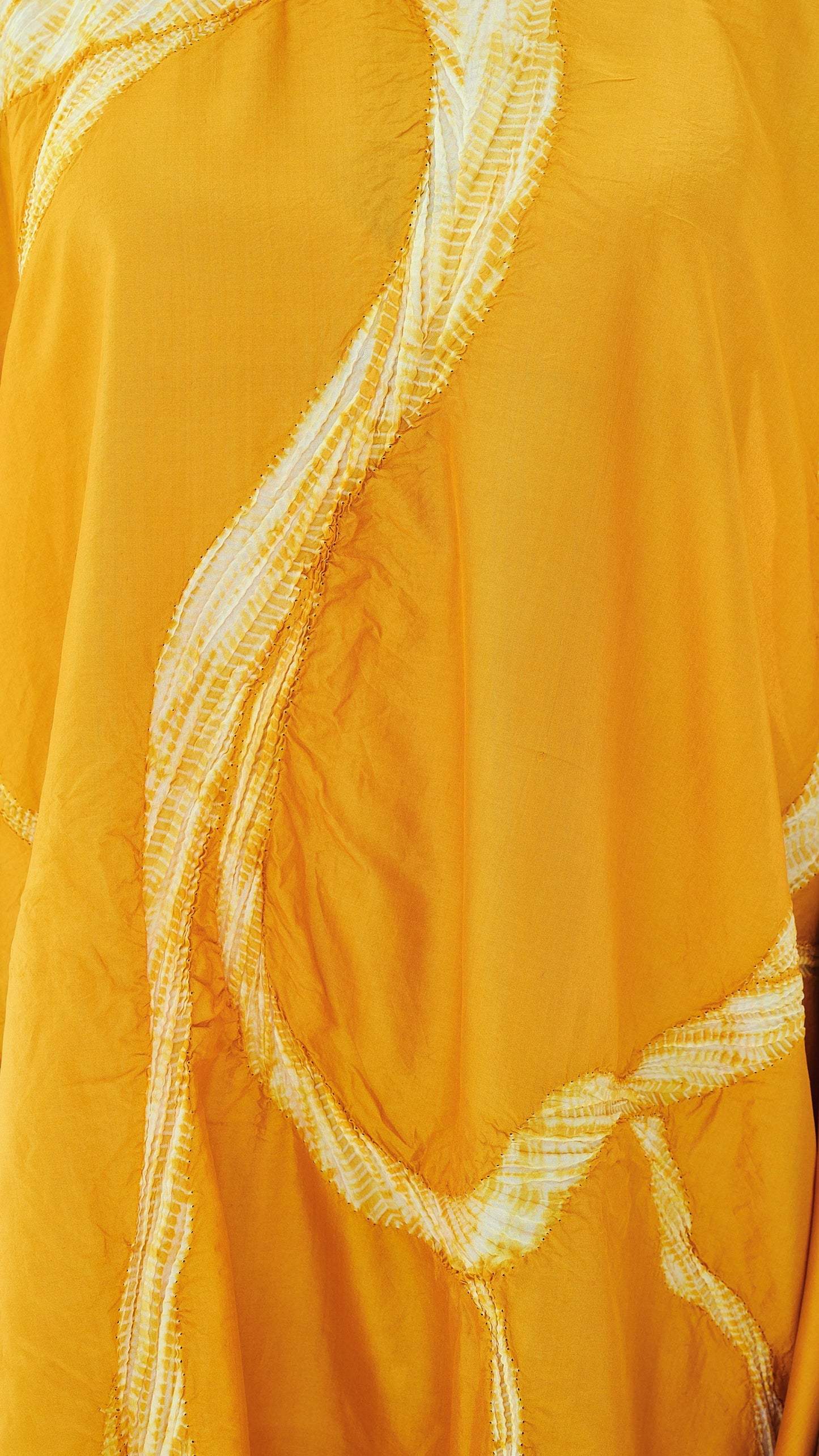 The Rhizo Kaftan takes its name from the Greek word for root, drawing inspiration from the architecture of root systems beneath the soil. A taproot motif extends from the neckline and flows down the length of the garment at both the front and back, echoing the natural downward movement of roots in search of nourishment.