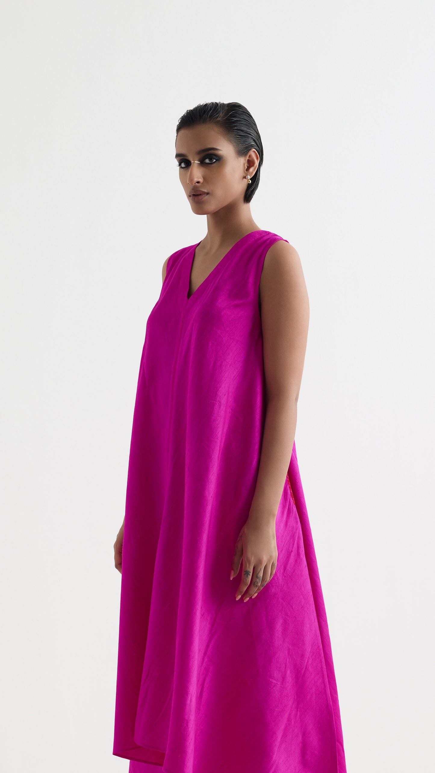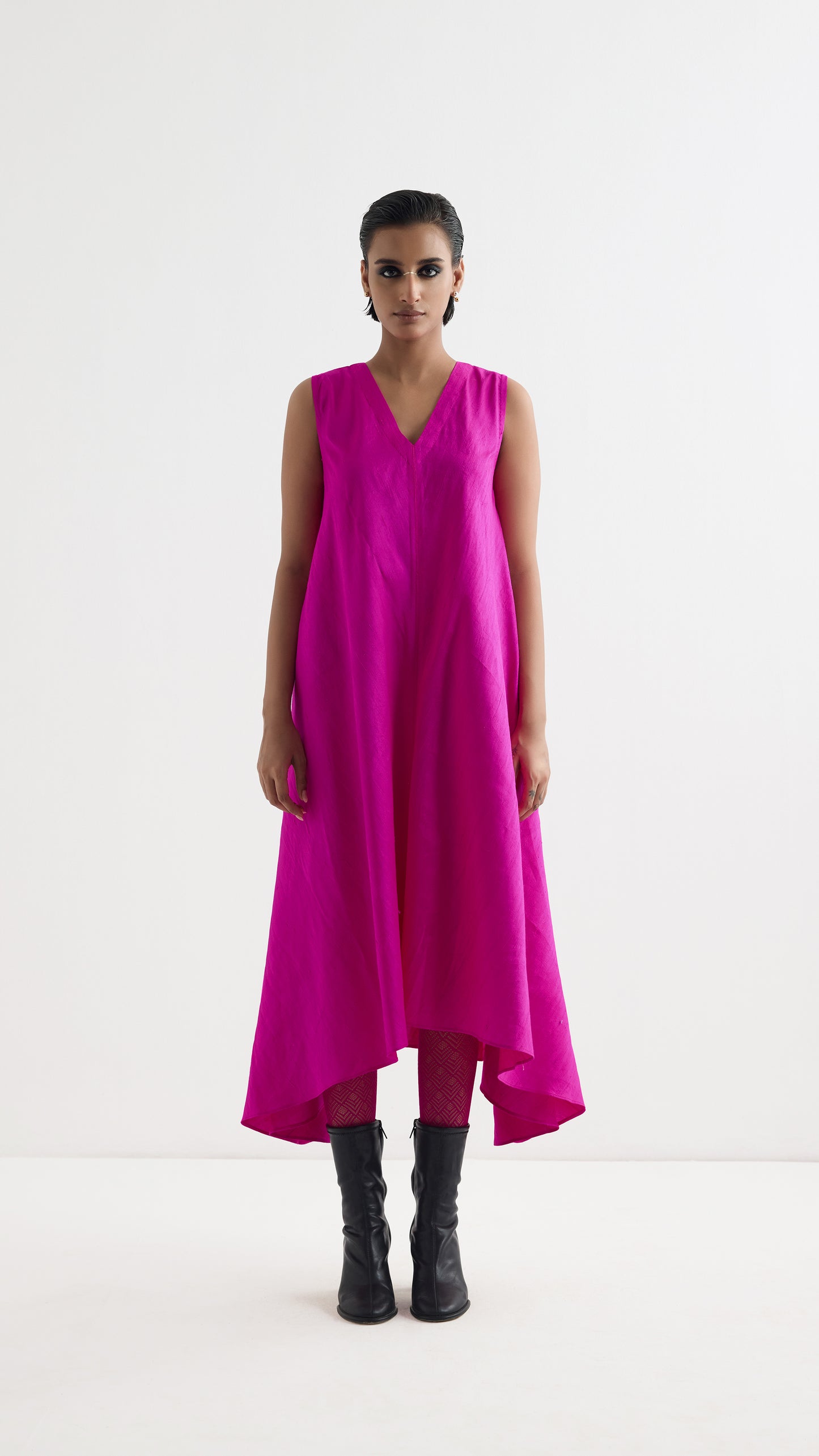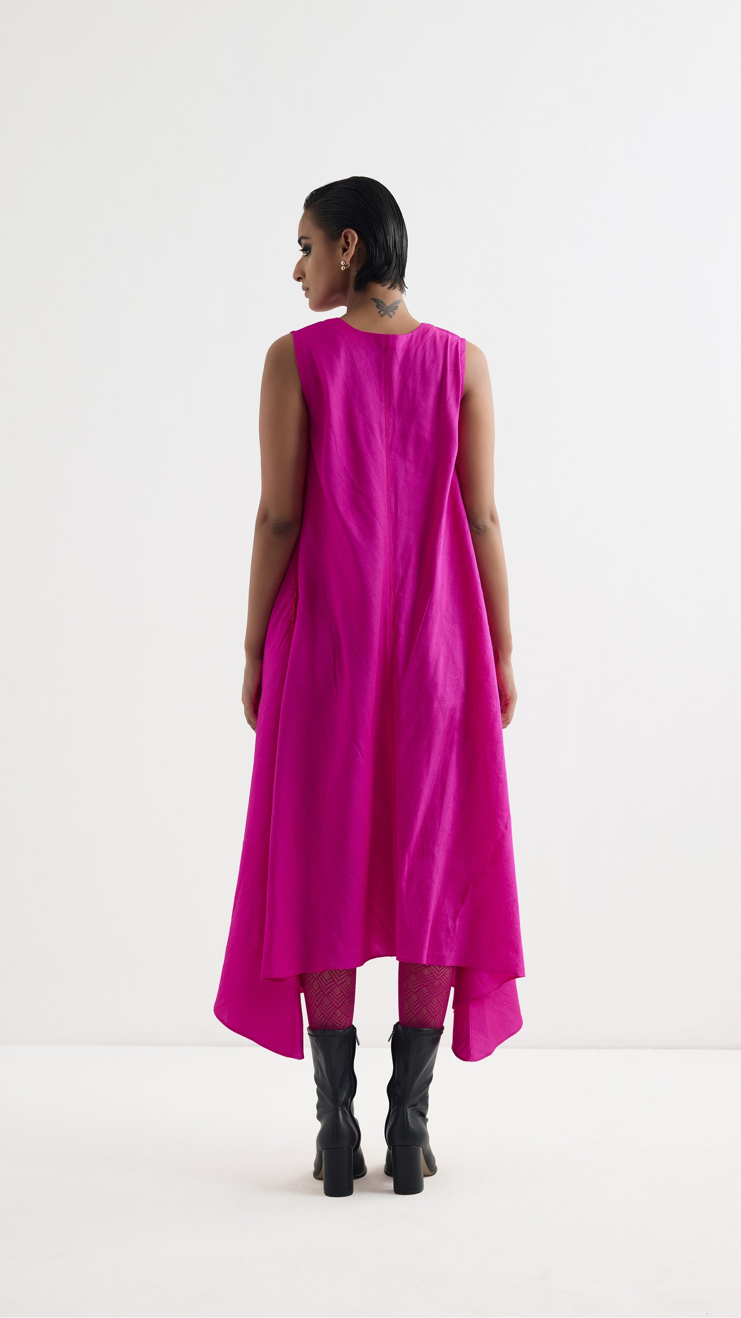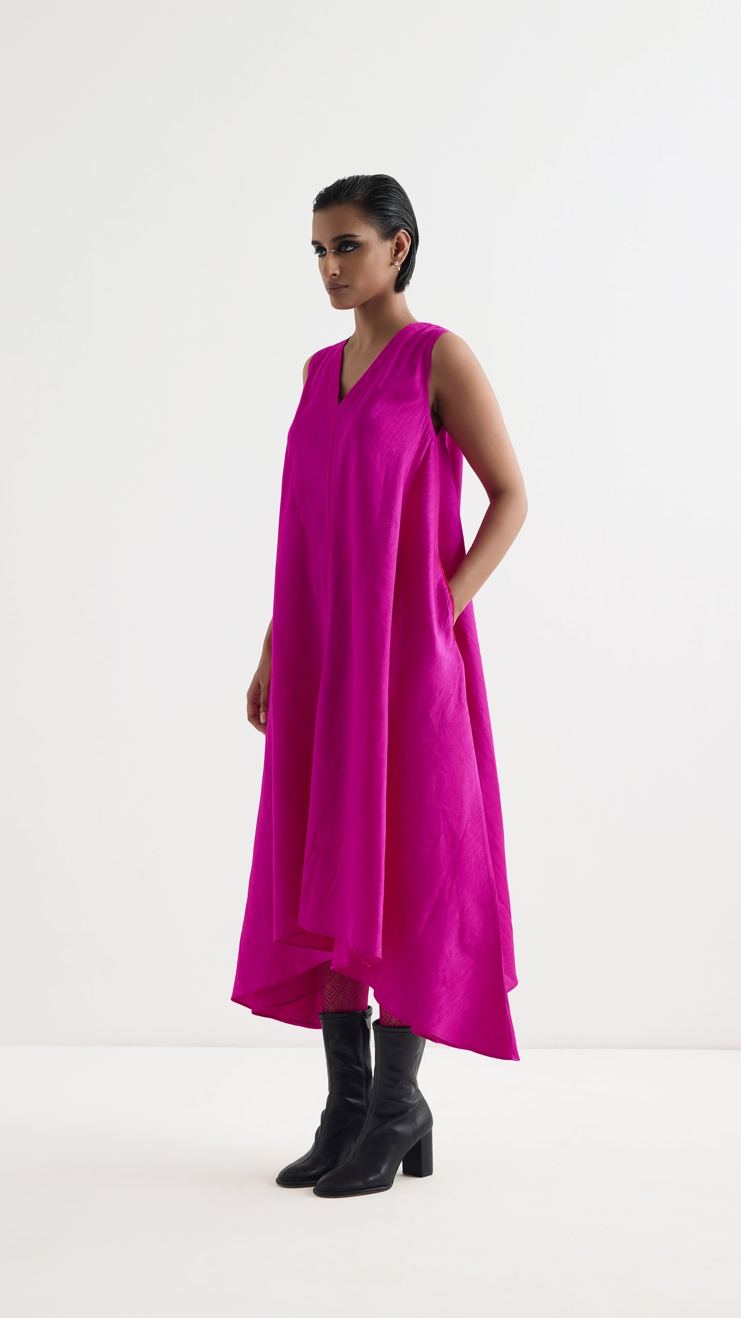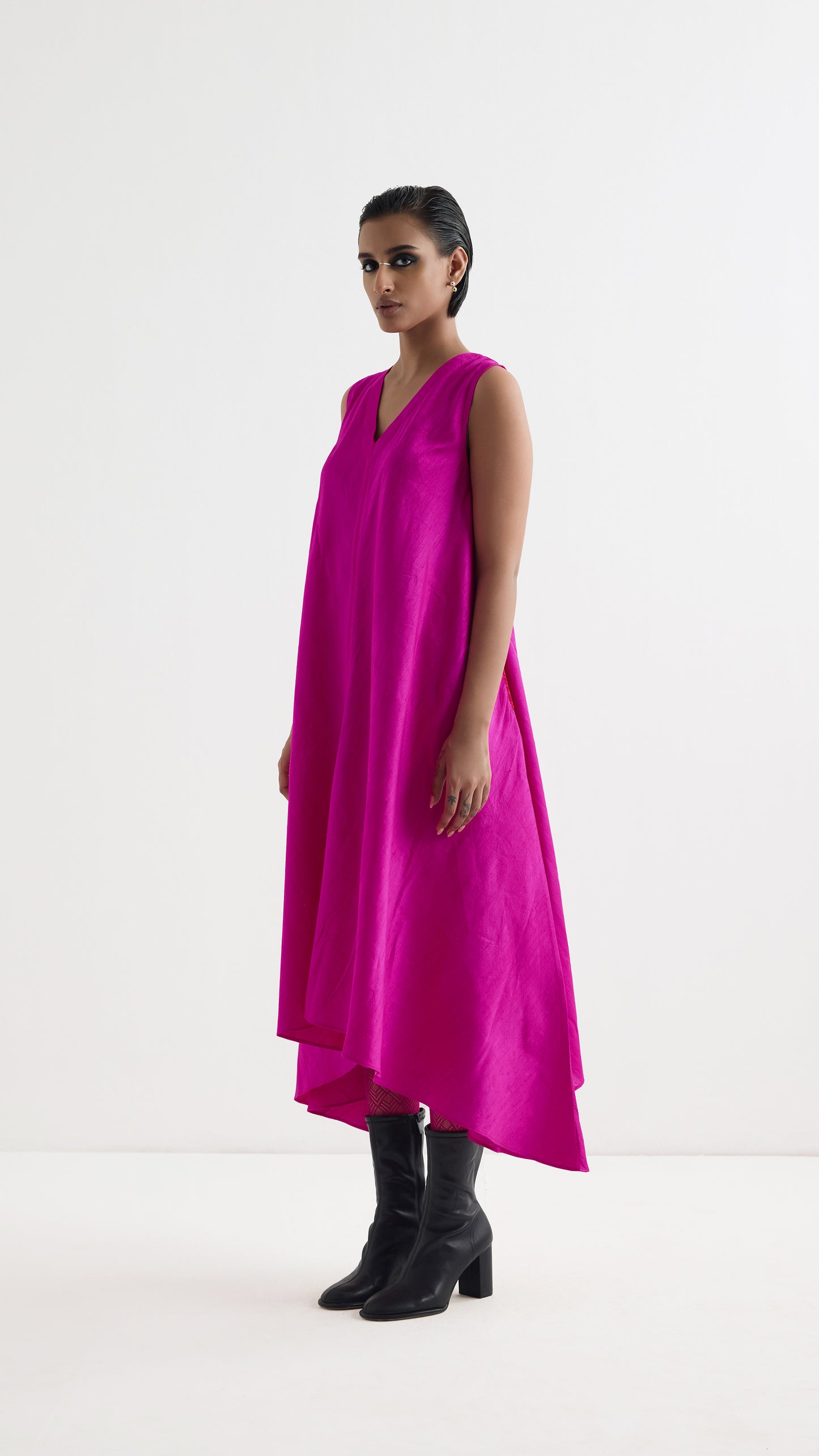 A raw silk bias dress featuring an intricate seam detail. The side seam pockets are finished with our signature shibori fabric welts.This asymmetric dress is a versatile dress that looks stunning with our capes.