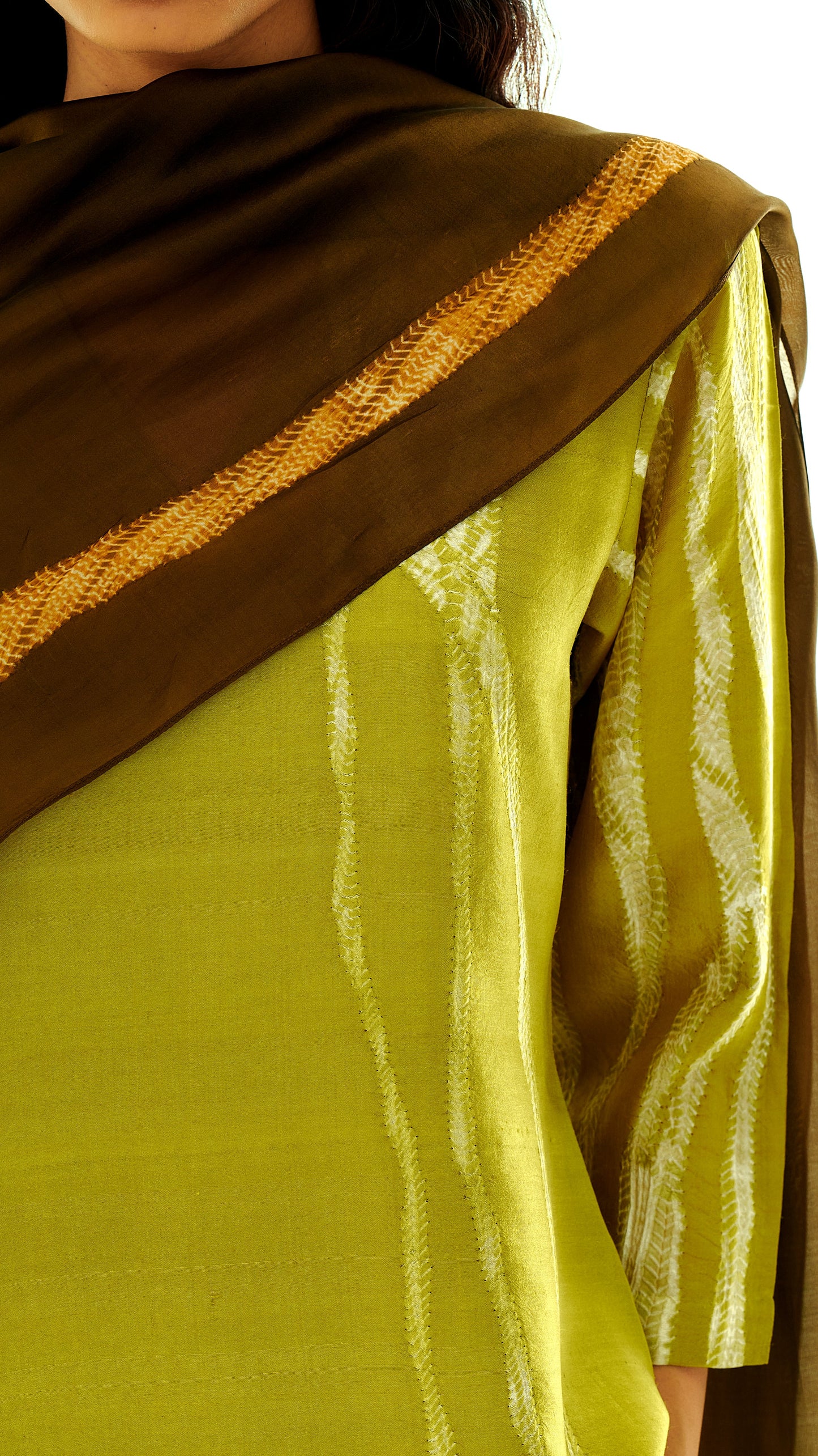 The Terra Dupatta takes its name from the Latin word for earth, reflecting the collection’s exploration of root systems and the soils that sustain them. A single band of guntai shibori runs along one side of the dupatta, forming a root-like line that traces the length of the textile.